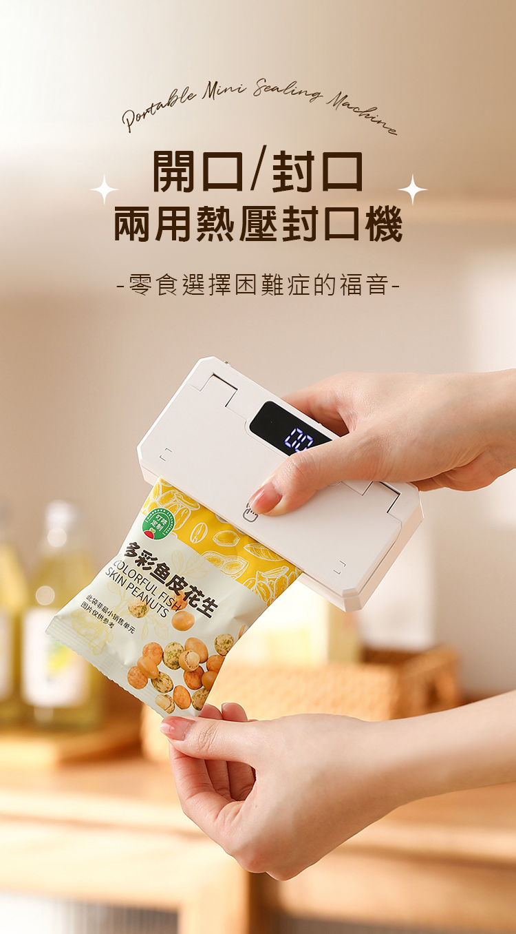 餅乾零食吃不完的時候🍪以前都會用橡皮筋綁👀密封性不夠好 餅乾很容易一下子就軟掉了😫用了這個迷你封口機之後保存得更好了😙😙密封性高 能有效的阻隔外界空氣 餅乾不再軟趴趴💪小小一隻輕鬆帶著走👜放進包包不佔空間👜不管是吃不完的餅乾🍪、零食🥜、水果🥝等等~或是分裝成旅行用的洗髮精、沐浴乳都可以呢✨【產品特色】封口/開口雙功能:即是封口機,也是開口機,打開包裝、封口包裝,一機搞定高溫封口:輕輕一壓,阻隔空氣中的灰塵與濕氣,保持乾淨與新鮮小巧方便攜帶:長度只有12公分*6公分,約手掌大小,放包包不佔空間密封性能好:儲存或者冷藏都安心雙收納設計:背面磁吸+掛繩設計,可吸於冰箱上,或懸掛收納,方便不佔空間【產品信息】品名:熱壓式便攜迷你封口機材質:ABS、電子零件、304不鏽鋼尺寸:12*6*3.5cm重量:約250g
