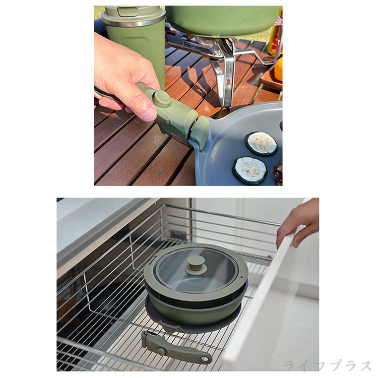 煎、炒、燉、煮、烤三鍋一組低調奢華,採用不沾塗層,加強不沾效果易清洗不卡油垢,合金材質,導熱效果佳,傳熱快且均勻,聚熱快,散熱慢,節能料理可有效節省料理時間,可拆卸矽膠握柄安全二段式設計,時尚美觀攜帶方便,適用電磁爐、瓦斯爐、電爐、紅外線爐、鹵素爐,室內、郊外、露營皆可安心使用,輕鬆創造行動廚房,讓您輕鬆烹飪美食。