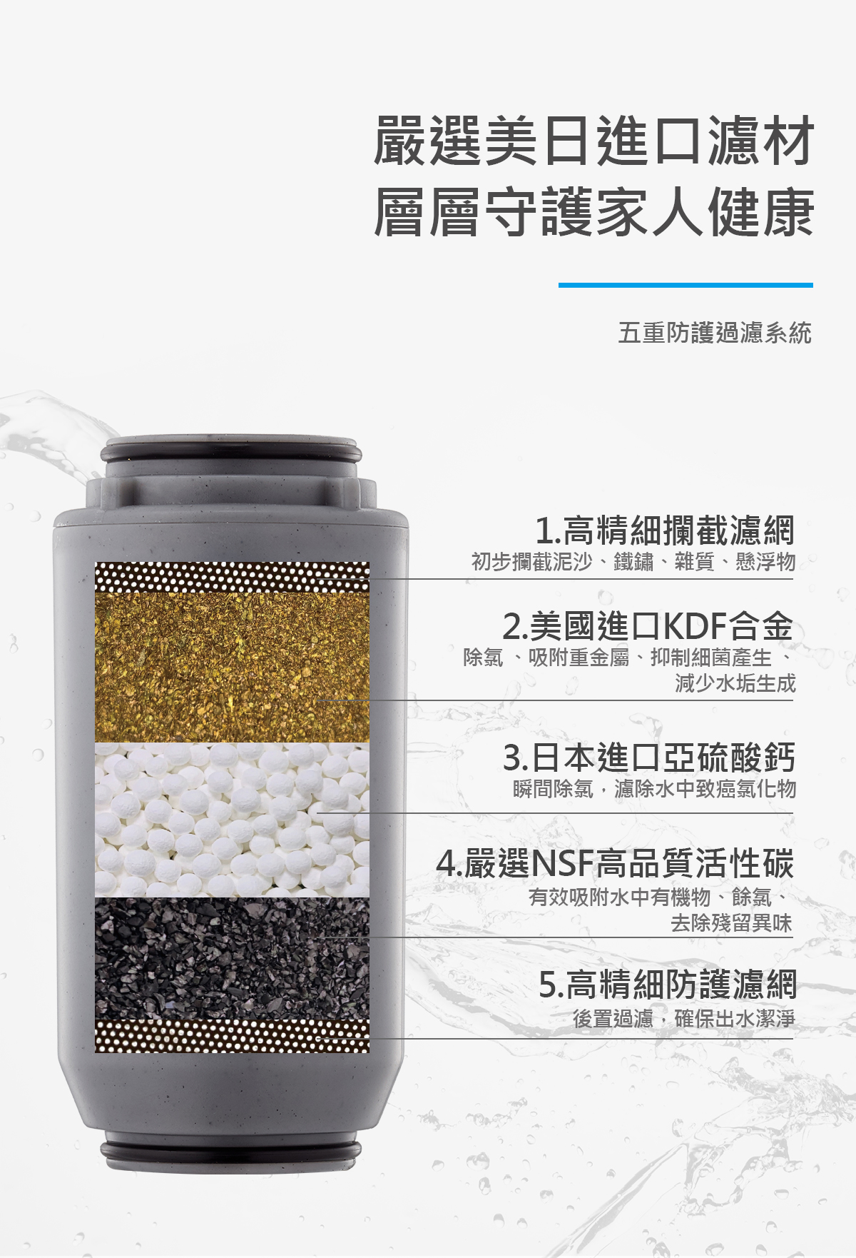 產品尺寸:11.5x5.5x5.5 cm過濾水量:20,000公升適用水溫:攝氏5-60度本體材質:ABS、不鏽鋼濾管材質:獨家專利竹炭PP濾管濾材:日本進口亞硫酸鈣、美國進口KDF合金、斯里蘭卡椰殼活性碳商品重量:275g濾心更換:4-6個月(視當地水質及使用量而定)通水量 8L/min產地:台灣外盒尺寸:沐浴器16x9.3x6cm/濾心9.2x4.5x4.5cm重量:沐浴器292g /濾心125g