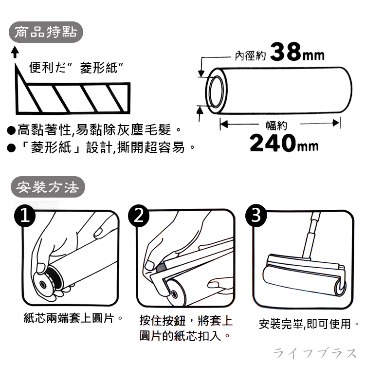 注意事項:勿使用於表面光滑之物品,如磁磚。黏性太強可在布沙發、床鋪、棉被、衣服布料等滾動數次後,再使用。