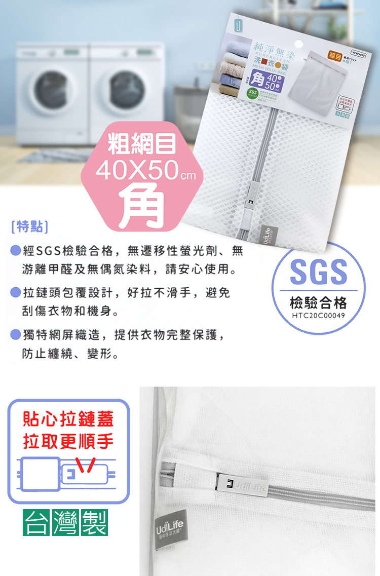 台灣製造品質安心,不易脫線不開口,無染材質通過SGS檢驗合格,使用安全又安心,防止衣物損壞變形保護衣物,防止衣物糾結不傷衣物,分類洗衣輕鬆曬衣服,不用再為了打結衣物而傷腦筋,使用方便,洗衣好幫手。