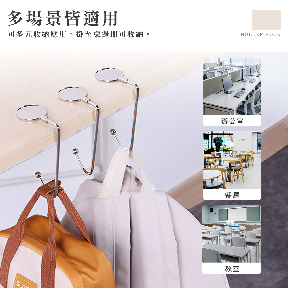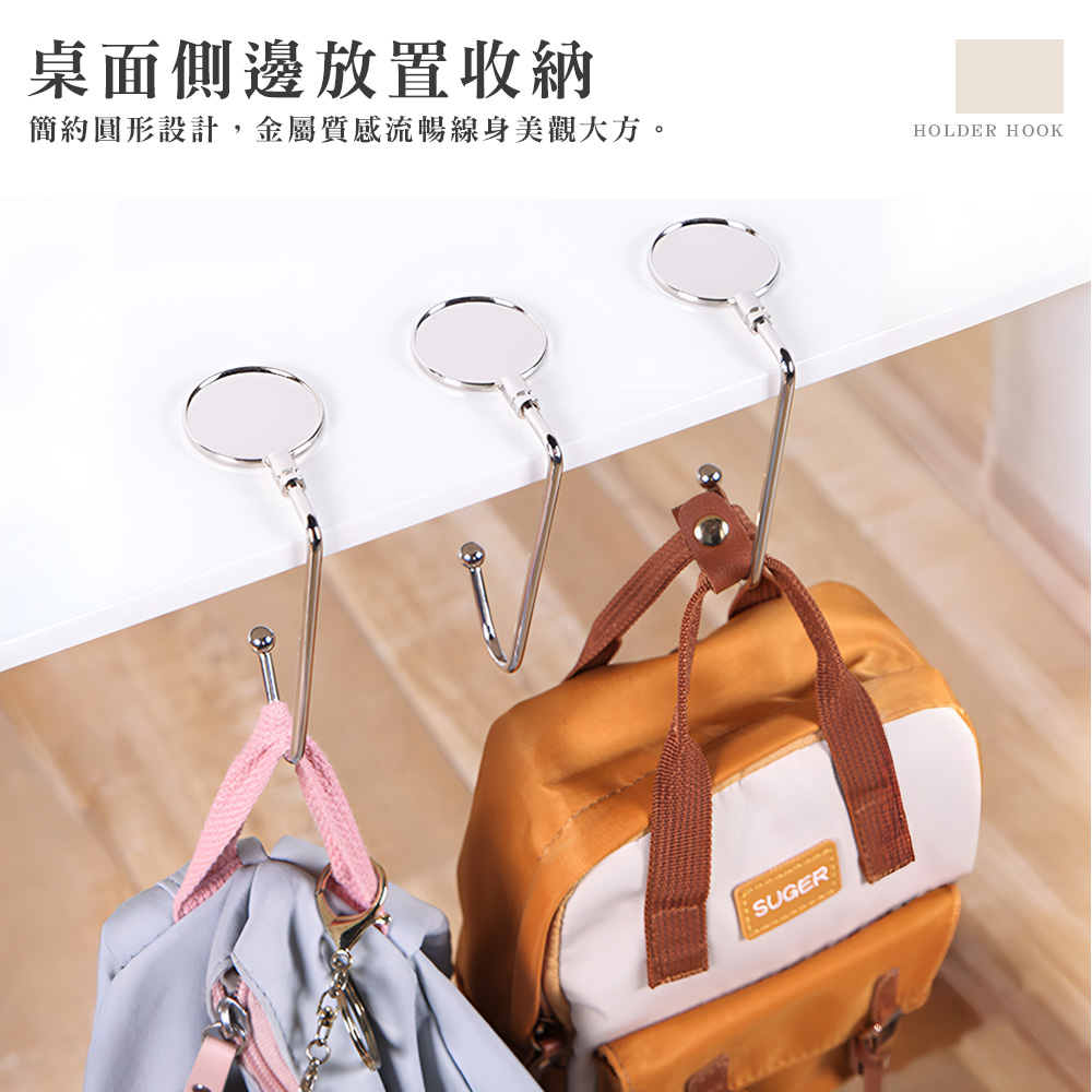 這款金屬桌邊掛勾特別適合通勤族與學生,能有效解決在咖啡廳、辦公室或教室裡,隨身包包無處安放的困擾。只需將圓盤底座輕放於桌面邊緣,即可創造一個穩固的掛物空間,讓您的包包、提袋隨手掛放,既不佔空間也遠離地面髒污。