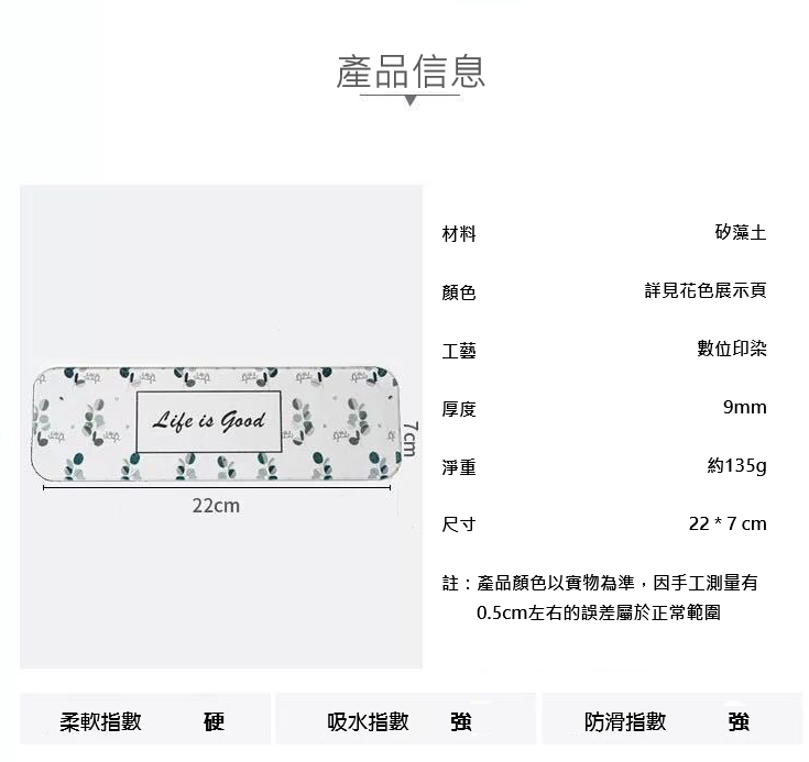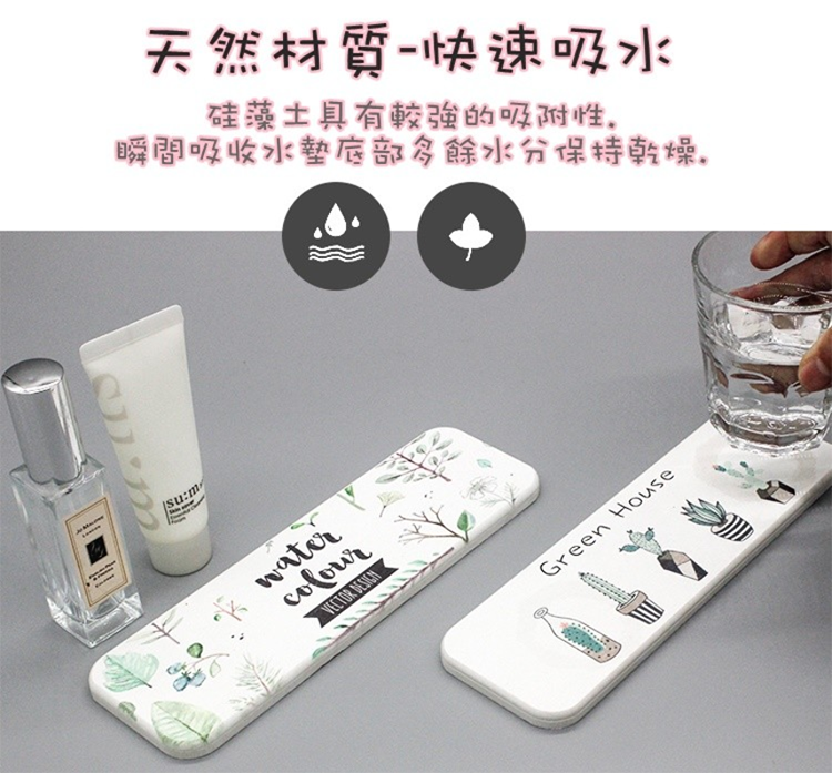 👍 硅藻土具有良好的吸濕性、隔熱性和淨化空氣...等特點,更是安全無毒的環保材質。👍 對於過敏物質及細菌、黴菌等有害物質,能徹底分解成水分子等無害物。👍 硅藻土的吸水力強,吸水率是自身重量的2-4倍,迅速吸水,快速風乾,隨時保持乾燥。👍 天然硅藻土的空隙度大,吸收性強,有淨化空氣的特點,您的居家生活變得簡單健康。👍 北歐風格數位印刷清新圖案,讓您增添生活樂趣,輕鬆美化您的家。🔶【產品規格】品名:矽藻土彩繪洗漱墊尺寸:彩色款-長22.5 * 寬7 * 厚0.9 cm 凹槽條紋款-長22*寬11*厚0.9cm材質:環保硅藻土承重:1公斤以下