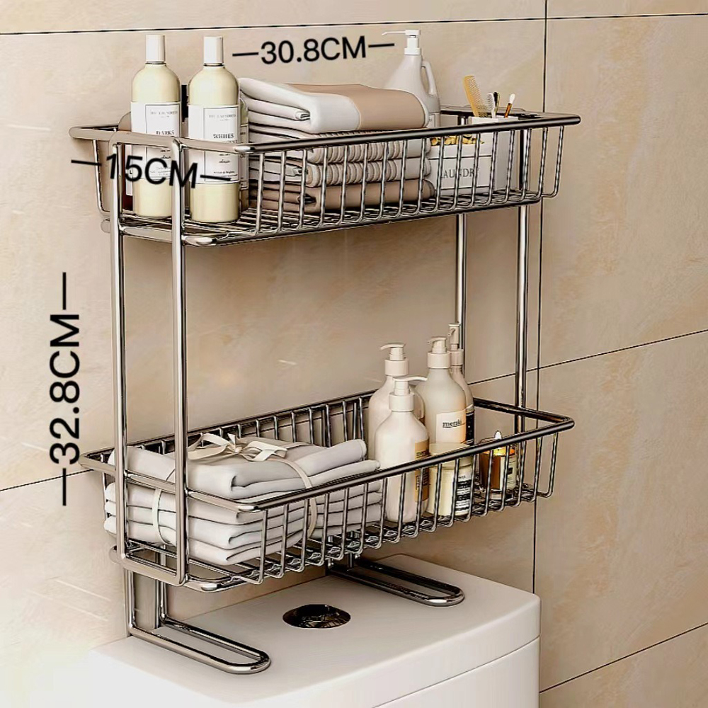 Double-layer, no-drill 304 stainless steel toilet top shelf with back clearance storage, bathroom wall-mounted storage rack.