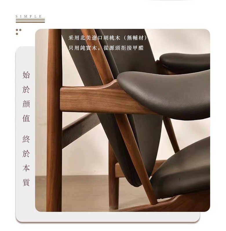 久坐就累?椅子好看卻不舒服?👉 這張「酋長椅」,一次把坐感、美感、用料全做到位下班回家,只想好好坐著放空但多數椅子不是太硬、就是坐久腰痠真正能「一坐就放鬆」的,其實不多⚙ 核心亮點:為什麼懂家具的人都選酋長椅?✅ 全球著名的 15 把大師椅之一不是網紅款,而是經典款1949 年,由「丹麥設計之父」Finn Juhl攜手工藝大師 Niels Vodder 打造至今仍被視為丹麥現代主義中,最具創意與辨識度的椅子設計之一👉 坐的不只是椅子,而是一段設計史✅ FAS 級北美黑胡桃木|從源頭拒絕廉價感✅ FAS 級北美白蠟木 |風格多樣✔ 100% 純實木✔ 不用貼皮、不用人造板✔ 大板直拼,結構穩定耐用✅ 木蠟油塗裝|不是上漆,是「養木頭」採用植物性木蠟油(亞麻籽油、葵花籽油、蜂蠟等)✔ 深入木材纖維滋養✔ 不封死毛孔,木頭能呼吸✔ 內外同時保護,不只是表面好看👉 越用越溫潤,時間會讓它更好看✅ 盾牌式曲線靠背 × 真皮包覆靠背採盾牌造型,完整貼合背部曲線搭配 真皮包覆坐墊與扶手✔ 包覆感強✔ 支撐到位✔ 觸感細膩、耐用耐看👉 坐感與質感,同時在線✅ 榫卯結構 × 四點拉扣|細節決定壽命✔ 傳統榫卯結構,穩定不搖晃✔ 四點拉扣設計,經典比例完整呈現✔ 高密度回彈填充,久坐不塌陷🌟產品規格一次看懂尺寸:950*890*950mm主材:FAS級白蠟木 | FAS級黑胡桃木輔材:高密度回彈海綿 | 進口頭層納帕牛皮安裝:客戶自行安裝台灣總代理合法銷售日本技術 × 台灣服務