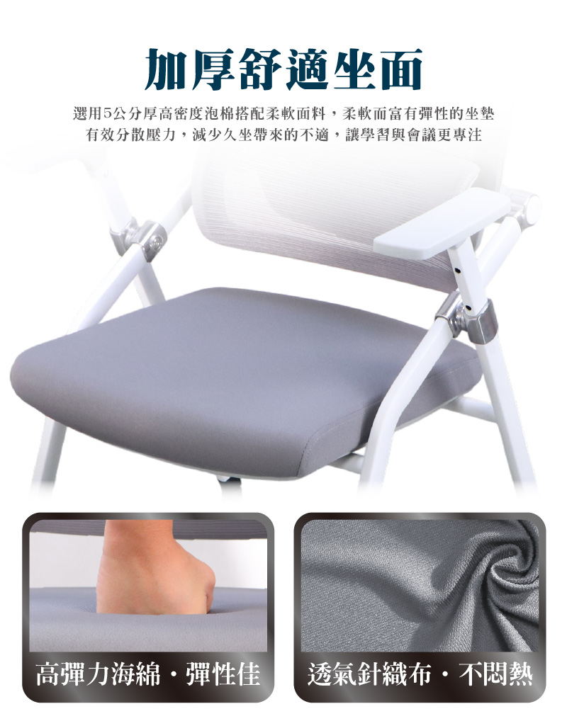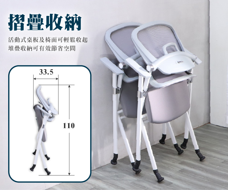 ★摺疊收納活動式桌板及椅面可輕鬆收起,可多張疊放排列,有效節省空間。