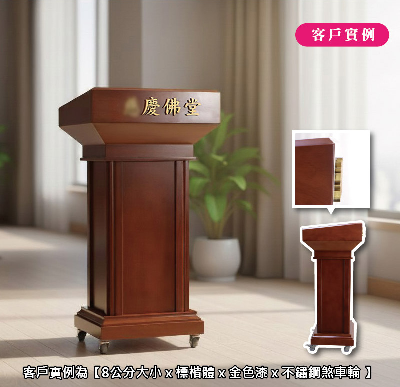講台配置寬大桌幅,展現專業大氣格局。無論是多份文件、筆電或簡報設備,都能輕鬆擺放,讓演講者自信掌握全場,打造沉穩莊重的專業氛圍