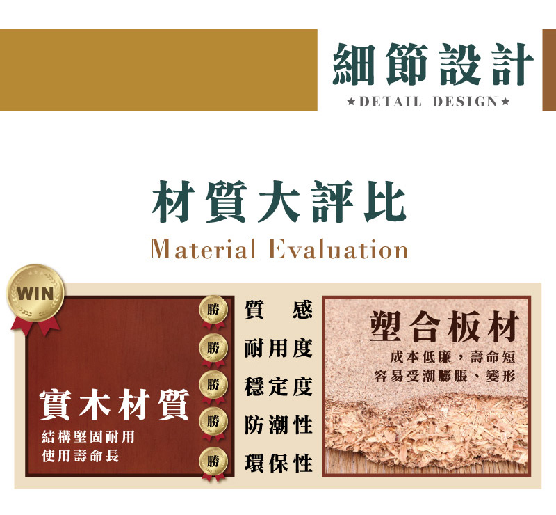 具備優異的質感與穩定度,結構堅固耐用,使用壽命長,完勝價格低廉的塑合板材質