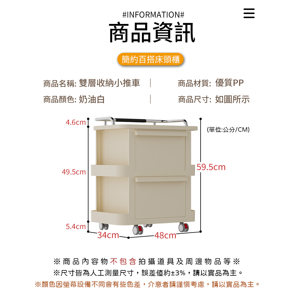 雙抽屜大容量收納 加厚材質 穩固耐重 附萬向輪 移動方便尺寸:34*48*59.5cm±3%
