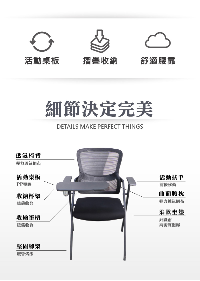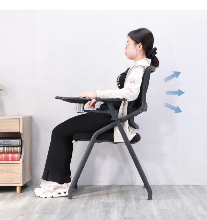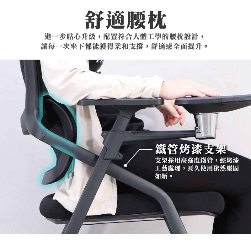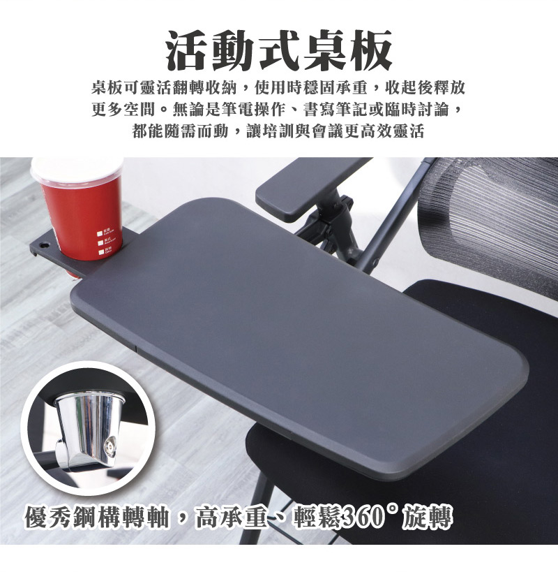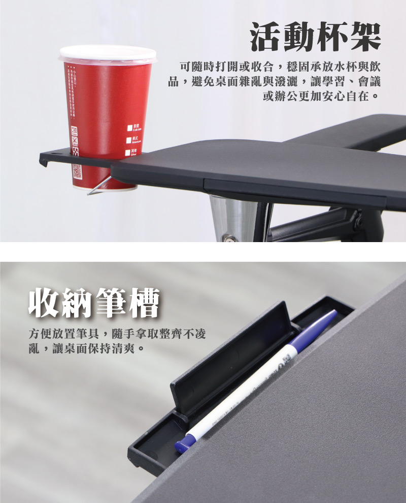 ■活動桌板(收納式杯架與筆槽)桌板可靈活翻轉收納,使用時穩固承重,收起後釋放更多空間。無論是筆電操作、書寫筆記或臨時討論,都能隨需而動,讓培訓與會議更高效靈活。