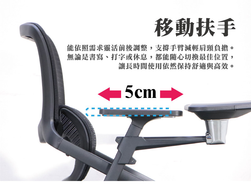 ■移動扶手能依照需求靈活前後調整,支撐手臂減輕肩頸負擔。無論是書寫、打字或休息,都能隨心切換最佳位置,讓長時間使用依然保持舒適與高效。