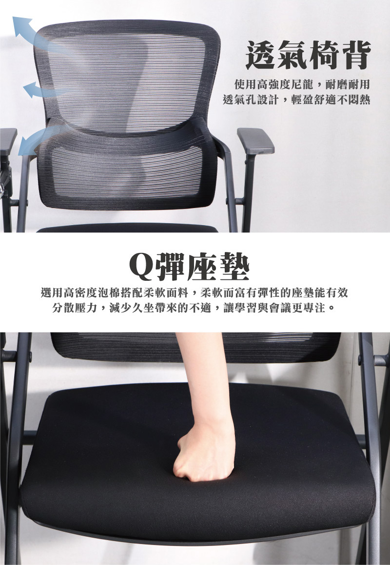 ■Q彈座墊選用高密度泡棉搭配柔軟面料,柔軟而富有彈性的座墊能有效分散壓力,減少久坐帶來的不適,讓學習與會議更專注。