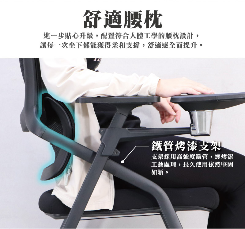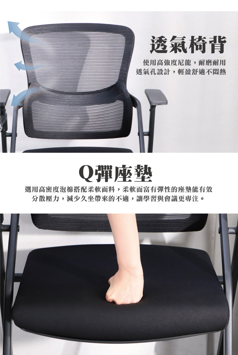 ■Q彈座墊選用高密度泡棉搭配柔軟面料,柔軟而富有彈性的座墊能有效分散壓力,減少久坐帶來的不適,讓學習與會議更專注。