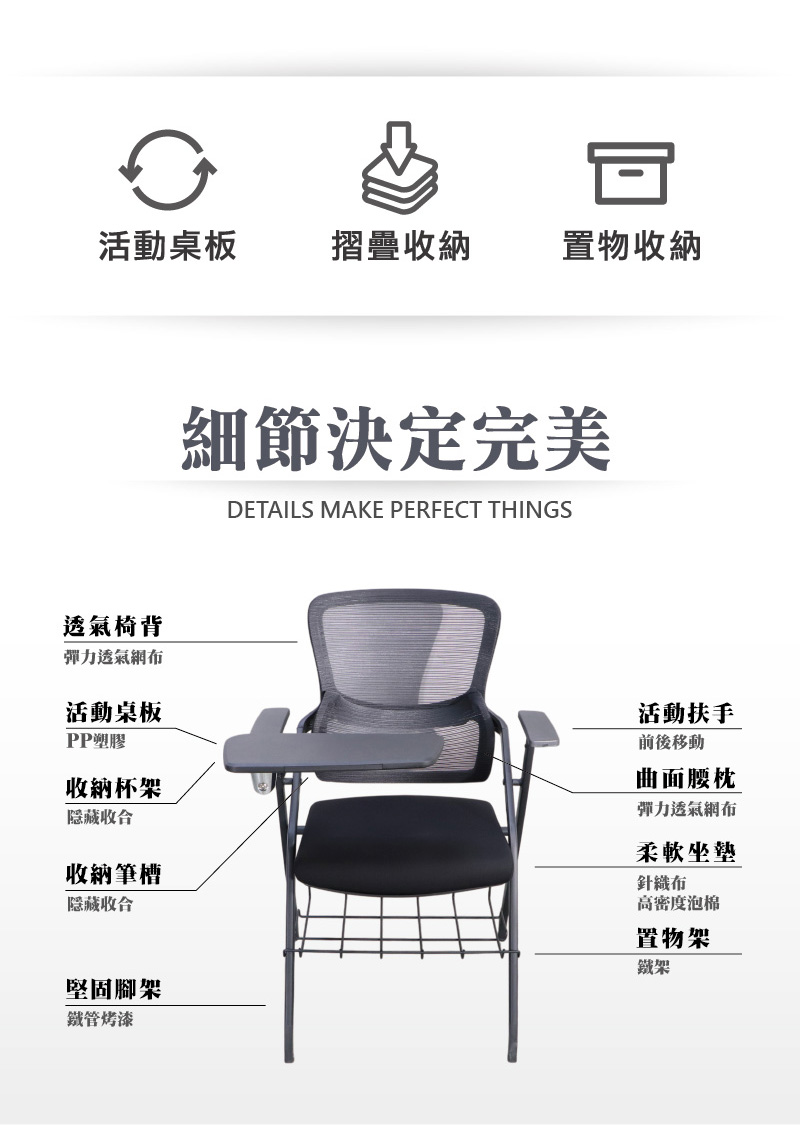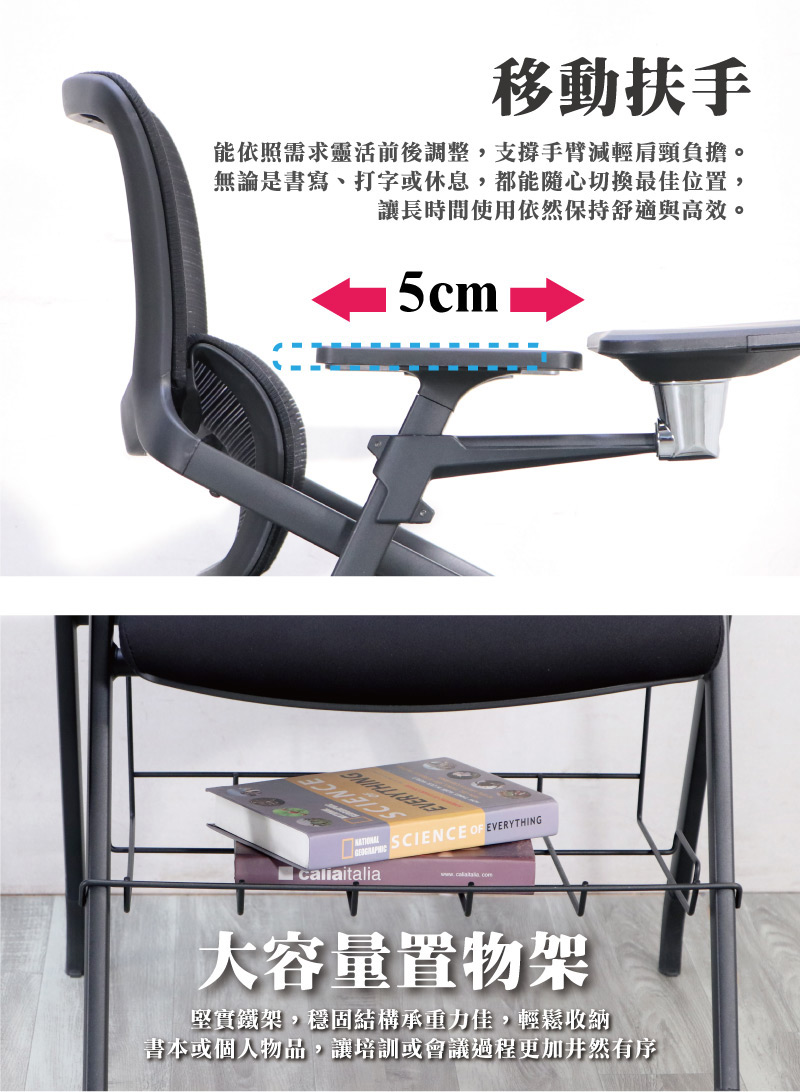 ■大容量置物架堅實鐵架,穩固結構承重力佳,輕鬆收納書本或個人物品,讓培訓或會議過程更加井然有序。