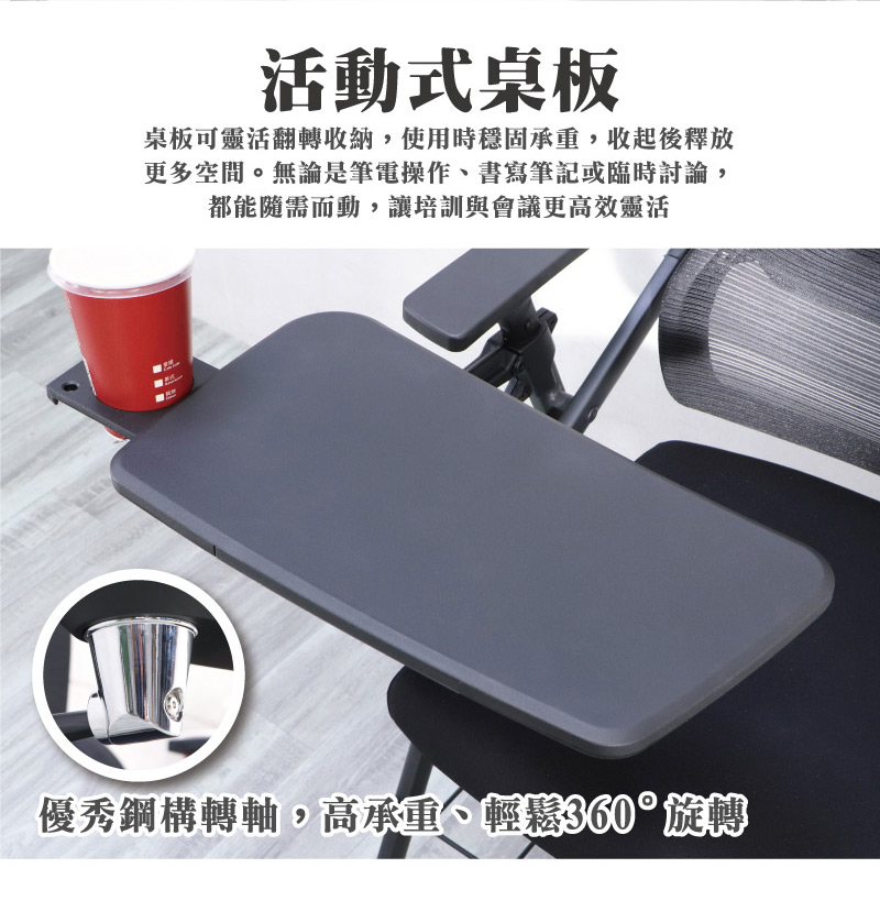 ■活動桌板(收納式杯架與筆槽)桌板可靈活翻轉收納,使用時穩固承重,收起後釋放更多空間。無論是筆電操作、書寫筆記或臨時討論,都能隨需而動,讓培訓與會議更高效靈活。