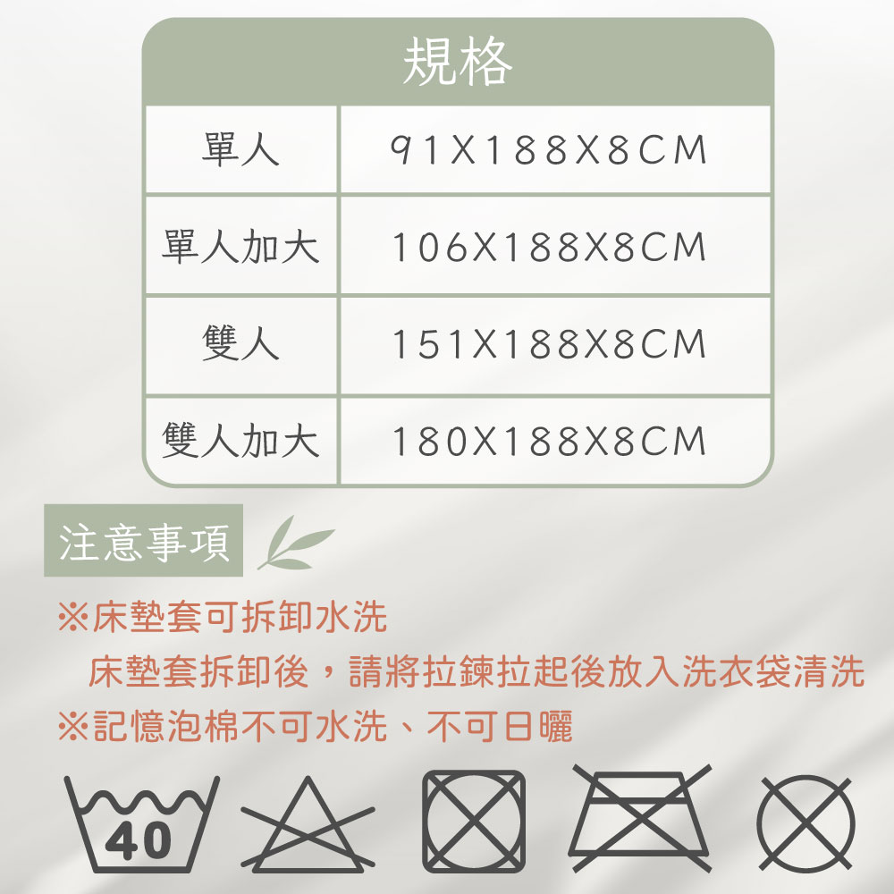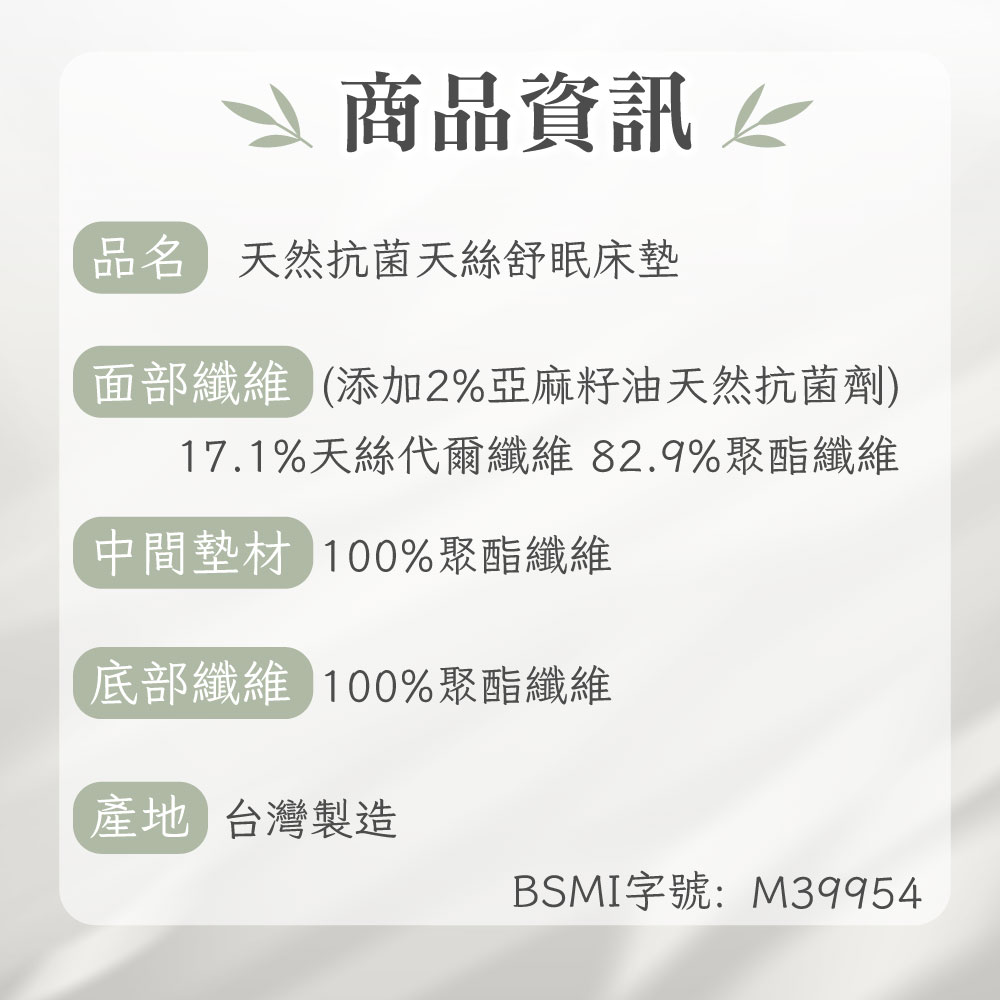品名:【Pure Sleep 純好眠】天然抗菌天絲舒眠床墊-單人面部纖維:(添加2%亞麻籽油天然抗菌劑)17.1%天絲代爾纖維+82.9%聚酯纖維中間墊材:100%聚酯纖維底部纖維:100%聚酯纖維尺寸:91X188X8CM(±2cm)產地:台灣進口商:茂榕數位科技有限公司地址:桃園市平鎮區廣東路57巷1號電話:0800-666865【注意事項】※商品圖片為實物拍攝,由於螢幕顯示色差、拍攝光線等因素,照片與實物可能略有差異,請以實物為準。※商品尺寸為人工測量,標示僅供參考,難免與實際商品尺寸略有誤差,誤差尺寸±2cm為國際驗貨標準可接受範圍。※拆封商品後,若有任何問題請先聯繫客服,將有專員為您服務。※注意! 以下說明不屬瑕疵範圍:1. 小於1-3cm尺寸測量誤差、些微不對稱2. (1cm極小污點/摺痕/刮痕/螢幕色差等3. 些微脫線/勾針/線頭/味道/五金刮痕4. 人為造成損壞或使用痕跡【退貨需知】※拆封商品時,為了保障雙方權益,開封時務必錄影留證。※鑑賞期為猶豫期,並非試用期。※提醒您!商品需要全新且包裝完整的情況下,才能辦理退貨退款;床墊屬於個人衛生用品,一旦經拆封或使用,易有接觸肌膚衛生疑慮,商品價值已受損,除非為瑕疵商品,否則無法受理退貨,購買使用前須特別留意,避免影響自身權益!