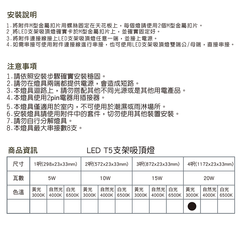 ◆商品規格與尺寸 商品尺寸:(高)117x(寬)2.3x(深)3.3/公分 商品包裝:(高130x(寬)2.5x(深)4/公分 商品重量:0.147kg 包裝重量:0.212kg 額定輸入功率:20W 功率因數:≧0.5 光源色溫:白光6500K /黃光3000K /自然光4000K 適用光源:不可更換LED 0.2Wx120顆 額定輸入電流:0.18-0.09A 額定輸入電壓:AC100-240V 50/60Hz 最大串接數:8支 驗證登錄:R43569 RoHS 驗證型號:GLD-T5F4DA /GLD-T5F4LA /GLD-T5F4NA 商品原產地:中國 入數:3入裝 ◆商品特色 1.通過CNS認證,品質安全有保障。 2.環保、超省電、無汞。 3.安裝容易,最多可串連8支。 4.取代傳統燈管40W。 5.有3種色溫供選擇,家用、餐廳、廚房、店面皆適用。 6.本產品已投保新台幣伍仟萬產品責任險。 白光6500K/高度明亮:居家照明、辦公室、圖書館百貨公司、醫院、賣場...等場所 自然光4000K/自然溫和:室內植物、植物燈、美容/美髮室、梳妝台…等場所 黃光3000K/溫馨舒適:臥室、餐廳、休息室、酒吧、咖啡廳...等場所