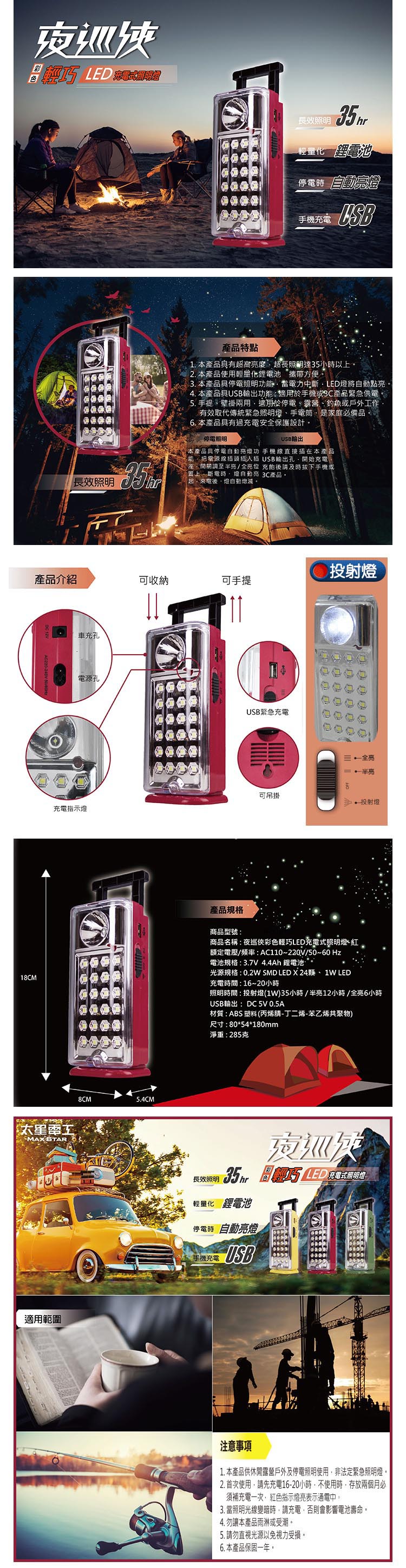 ◆商品特色1.具有超高亮度,超長照明達35小時。2.使用輕量化鋰電池,攜帶方便。3.具有停電照明功能,當電力中斷,LED燈將自動點亮。4.具USB輸出功能,適用於手機或3C商品緊急供電。5.手提、壁掛兩用,有效取代傳統緊急照明燈、手電筒,是家庭必備品。6.具有過充電安全保護設計。7.適用場所:戶外、露營、釣魚、停電、汽修、保全、地震、火災…等。 ◆商品規格與尺寸商品尺寸:(高)18x(寬)8x(深)5.4/公分包裝尺寸:(高)22.1x(寬)11.6x(深)8.4/公分商品重量:0.285kg包裝重量:0.402kg額定電壓/頻率:AC110V~220V/50~60Hz電池規格:3.7V 4.4Ah鋰電池光源規格:0.2W SMD LEDx24顆/1W LED充電時間:16~20小時照明時間:投射燈1W/35小時、半亮/12小時、全亮/6小時材質:ABS塑料(丙烯-丁二烯- 苯乙烯共聚物)生產地:中國◆注意事項1.本產品供休閒露營戶外及停電照明使用,非法定緊急照明燈。2.首次使用,請先充電16~20小時,不使用時,存放兩個月必須補充電一次, 紅色指示燈亮表示通電中。3.當照明光線變暗時,請充電,否則會影響電池壽命。4.勿讓本產品雨淋或受潮。5.請勿直視光源以免視力受損。6.本產品保固一年。◆警告1.請勿擅自拆解、修理或改造產品。2.請勿在水中及易燃易爆等場所使用。