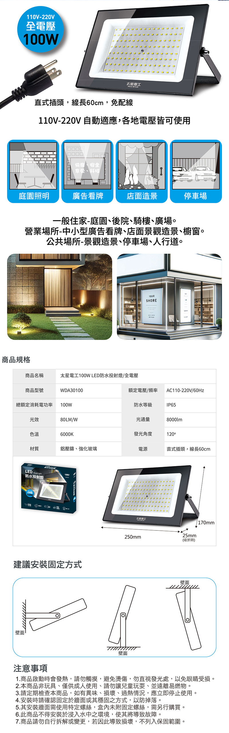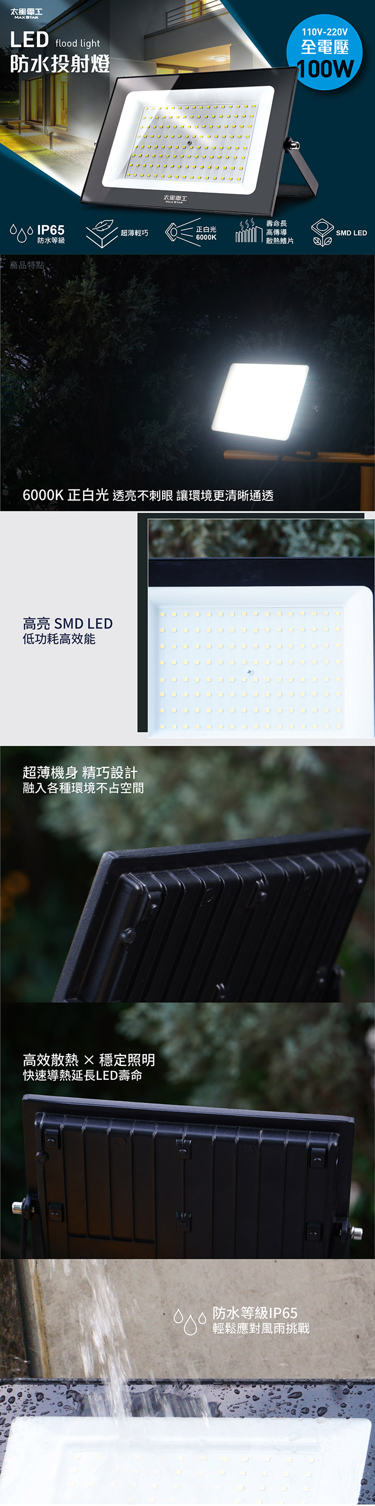 ◆商品特色1. 超薄輕巧,不佔空間,美觀大方。2. 採用最新SMD LED製程。3. 光源為正白光6000K。4. 高傳導散熱鰭片,使用壽命長。5. 螺絲鍍鋅材質,不易生鏽。6. 強化玻璃不易破碎,使用較安全。7. 低耗能,超省電。8. 固定架可收納設計。9.本產品已投保新台幣三仟伍佰萬產品責任險。商品應用廣泛(戶外專用)一般住家-庭園、後院、騎樓、廣場。營業場所-中小型廣告看牌、店面景觀造景、櫥窗。公共場所-景觀造景、停車場、人行道。◆商品規格與尺寸商品尺寸:(高)17x(寬)25x(深)2.5/公分商品包裝:(高)20.4x(寬)25x(深)3/公分商品重量:0.70 kg包裝重量:0.75kg額定電壓/頻率:AC110V-220V/60Hz總額定消耗電功率:100W防水等級:IP65光效:80-90LM/W光通量:8000 lm色溫:6000K發光角度:120°材質:鋁壓鑄、強化玻璃原產地:中國