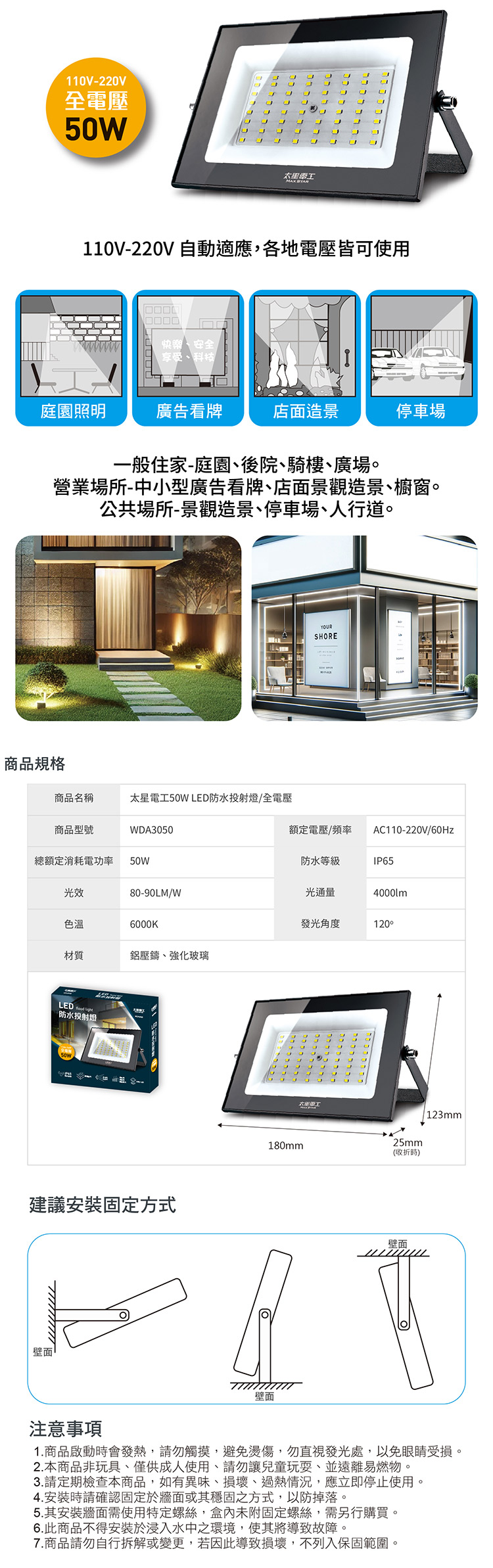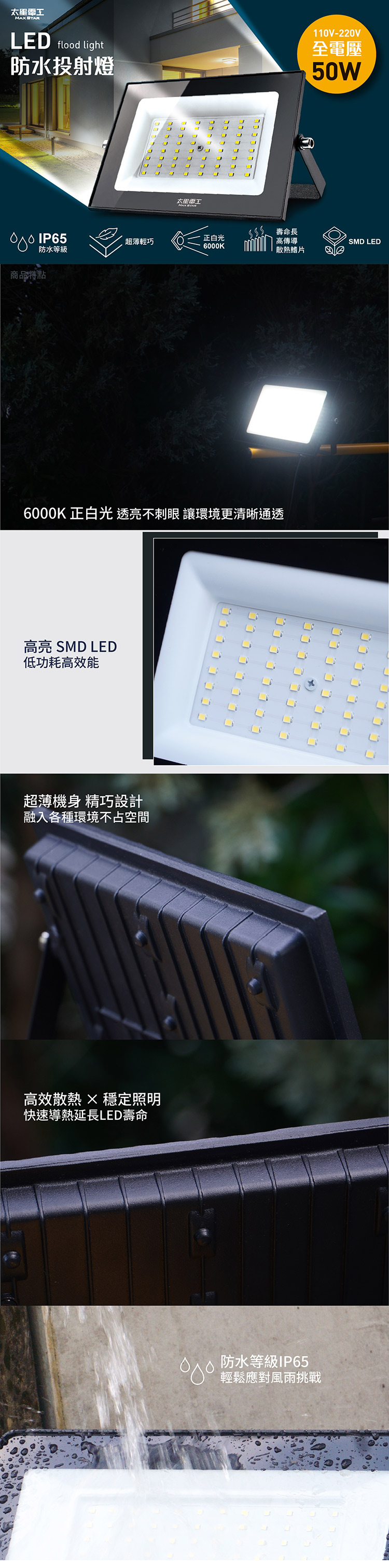 ◆商品特色1. 超薄輕巧,不佔空間,美觀大方。2. 採用最新SMD LED製程。3. 光源為正白光6000K。4. 高傳導散熱鰭片,使用壽命長。5. 螺絲鍍鋅材質,不易生鏽。6. 強化玻璃不易破碎,使用較安全。7. 低耗能,超省電。8. 固定架可收納設計。9.本產品已投保新台幣三仟伍佰萬產品責任險。商品應用廣泛(戶外專用)一般住家-庭園、後院、騎樓、廣場。營業場所-中小型廣告看牌、店面景觀造景、櫥窗。公共場所-景觀造景、停車場、人行道。◆商品規格與尺寸商品尺寸:(高)12.3x(寬)18x(深)2.5/公分商品包裝:(高)15.7x(寬)18.2x(深)2.8/公分商品重量:0.36kg包裝重量:0.39kg額定電壓/頻率:AC110V-220V/60Hz總額定消耗電功率:50W防水等級:IP65光效:80-90LM/W光通量:4000 lm色溫:6000K發光角度:120°材質:鋁壓鑄、強化玻璃原產地:中國