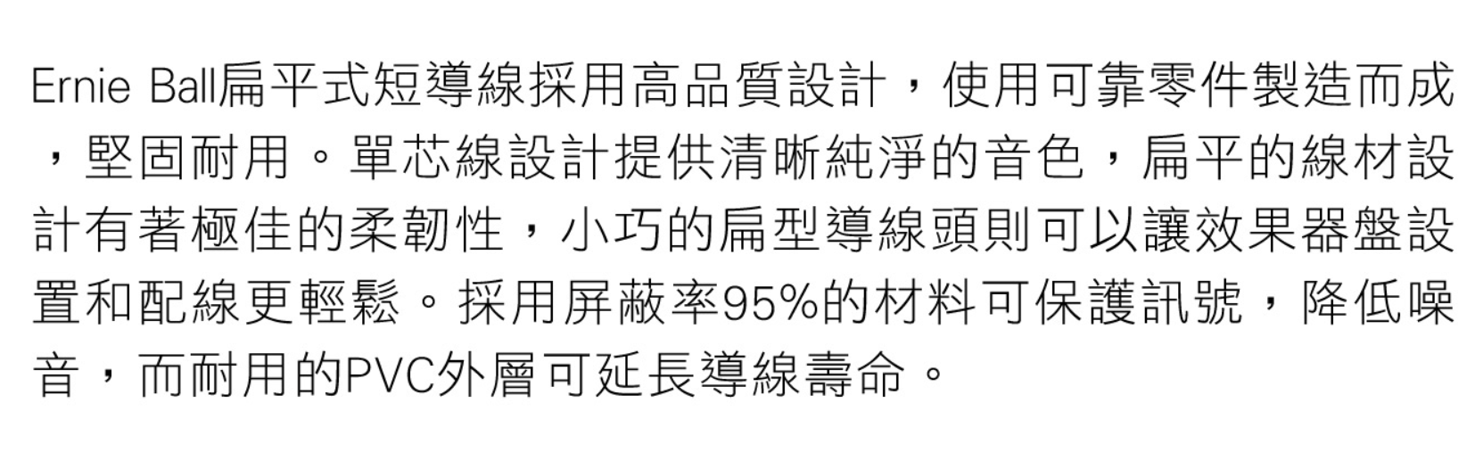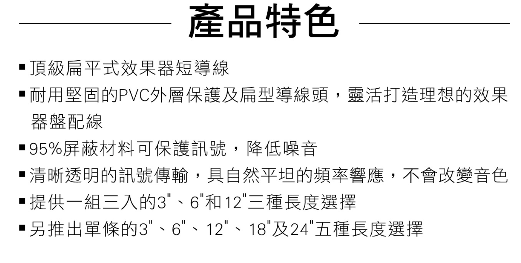 ● 耐用堅固的PVC外層保護及薄型導線頭更靈活打造理想的效果器盤配線