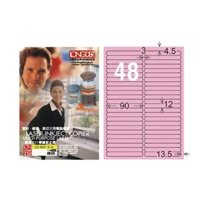 【龍德】LONGDER 三用電腦標籤 A4 48格 12*90mm粉紅105張 3盒/組 LD-869-R-A(適用雷射、噴墨、影印)