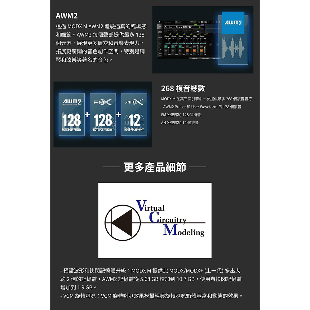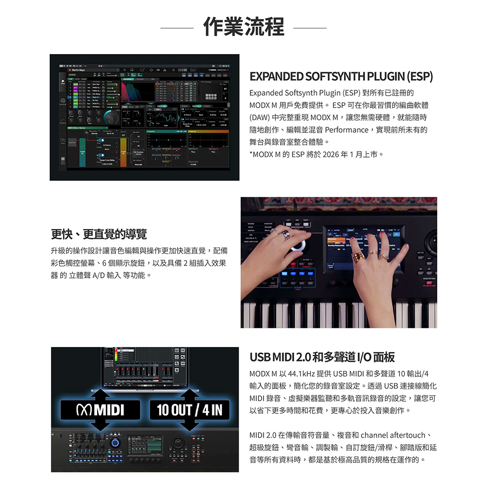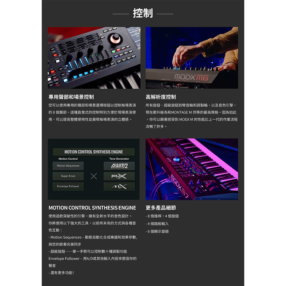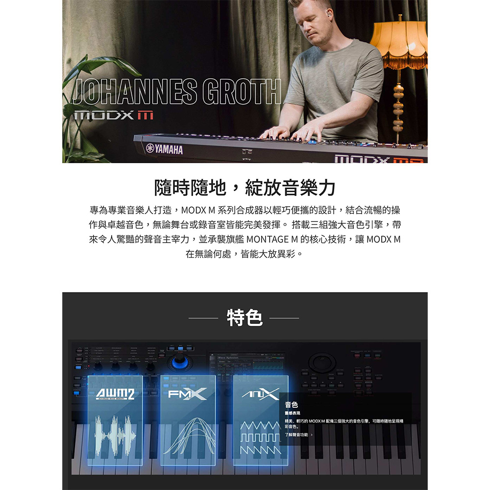 61 鍵 MODX M6 合成器專為專業人士打造,擁有最輕巧便攜的機身,即使是61鍵,也提供完整無與倫比的音色、表現力,以及極輕巧就手的琴鍵配重,手感極佳。搭載三組強大音色引擎,帶來令人驚豔的音色調製力,並承襲旗艦 MONTAGE M 的核心技術,讓 MODX M 得以在舞台與錄音室中大放異彩。
