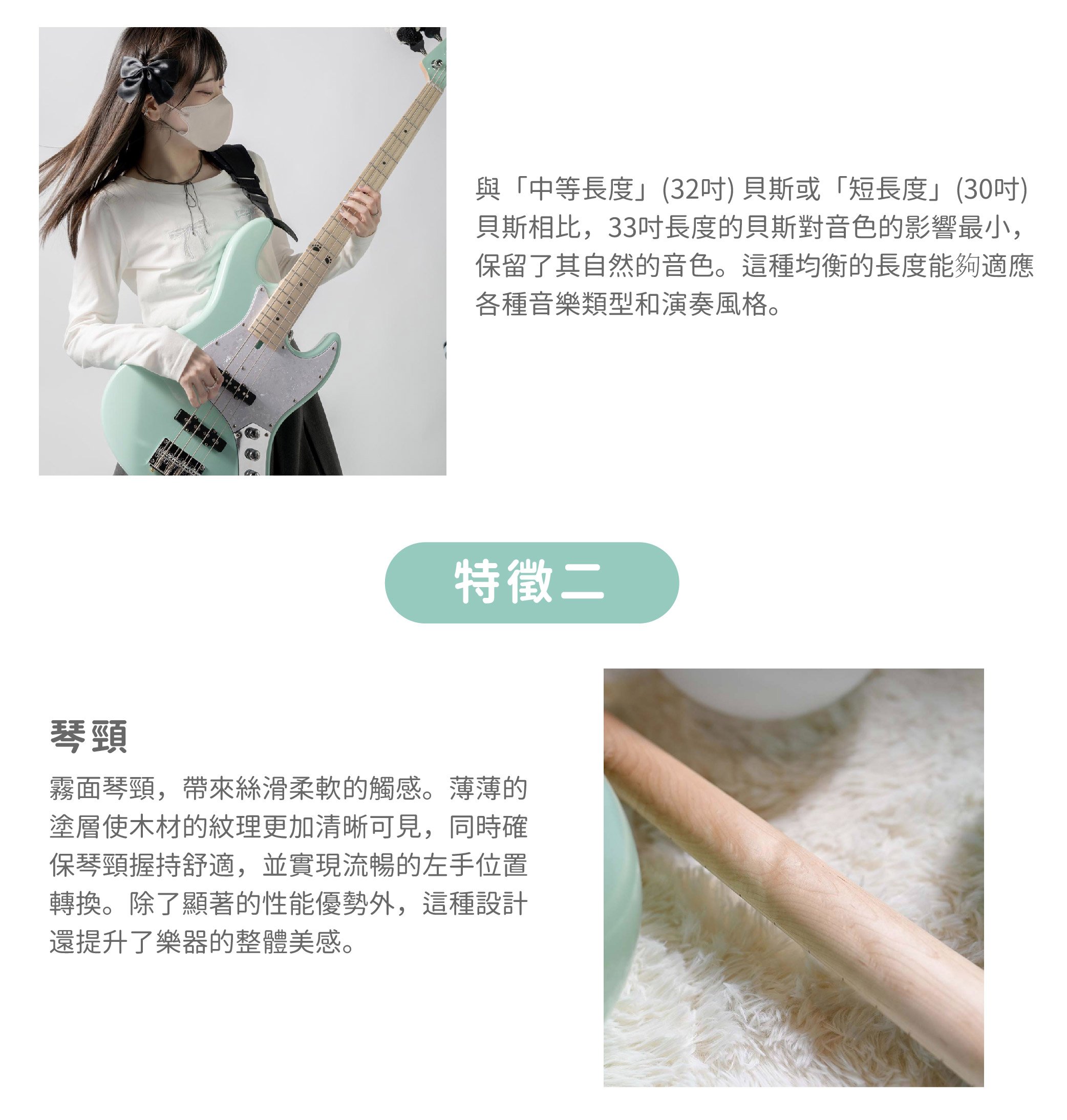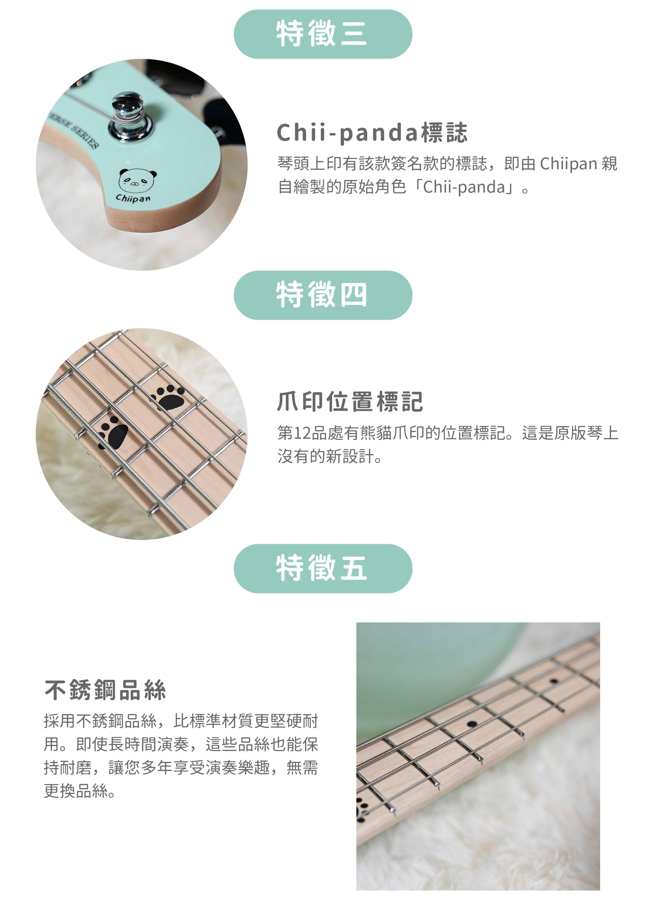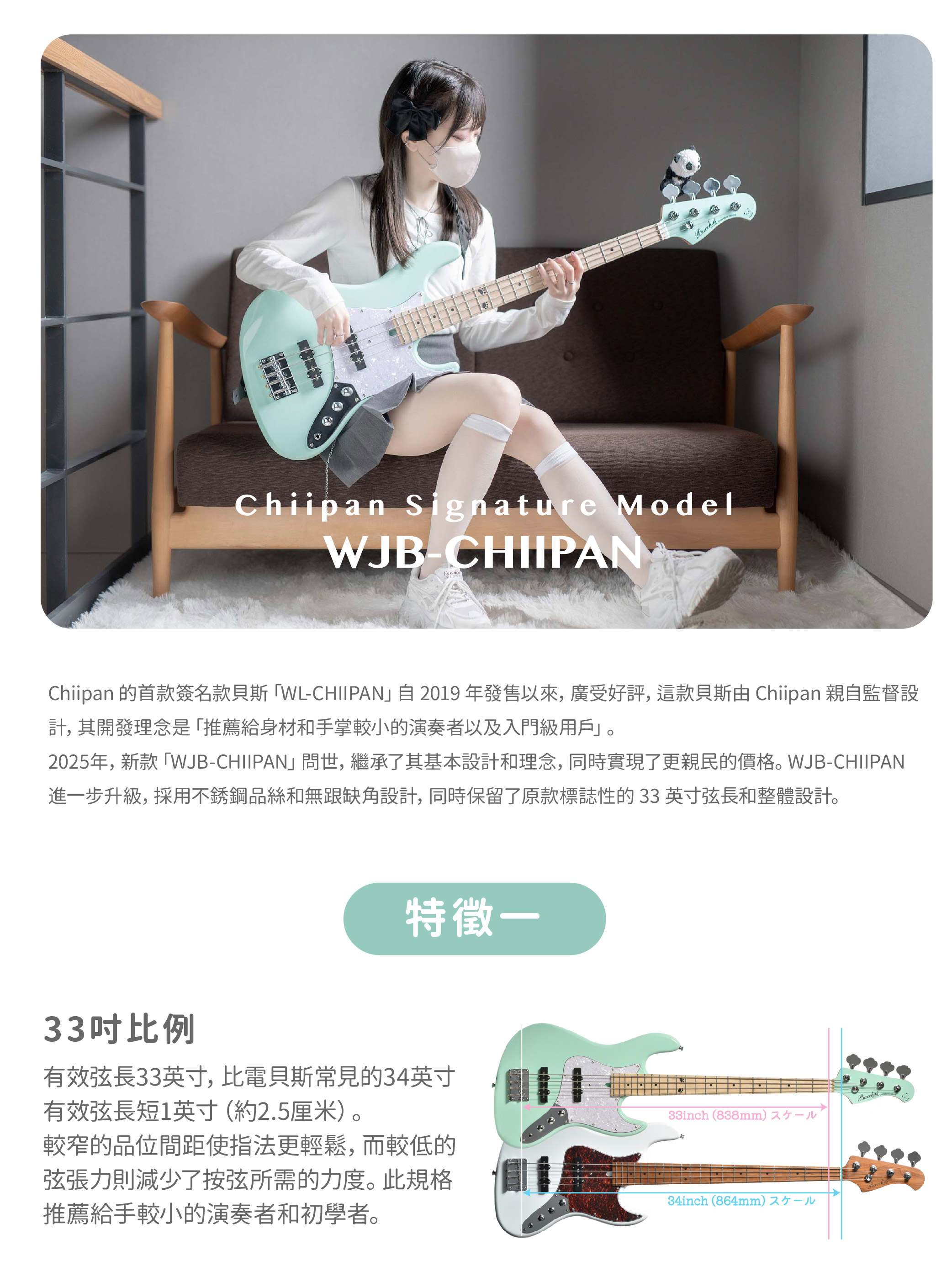 Chiipan Signature Bass 採用比標準 34 吋規格短約 $2.5$ 公分的 $33$ 吋短弦長(Short Scale)。