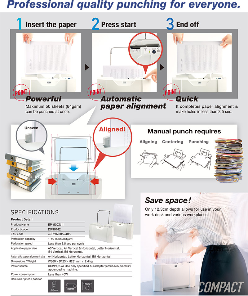 【商品介紹】打孔張數:1~50張 (64磅紙)打孔速度:約3.5秒孔洞直徑:6mm雙孔距離:80mm打孔邊距:12mm自動整紙:限A4/B5/Letter橫向機器尺寸:360x123x231mm機器重量:2.4KG電源:110V/60Hz附紙張支架可輔助操作(可打A3短邊) ※貨運認定為偏遠地區及外島,運費另外計算廠商代號:MA1責任代號:5UX