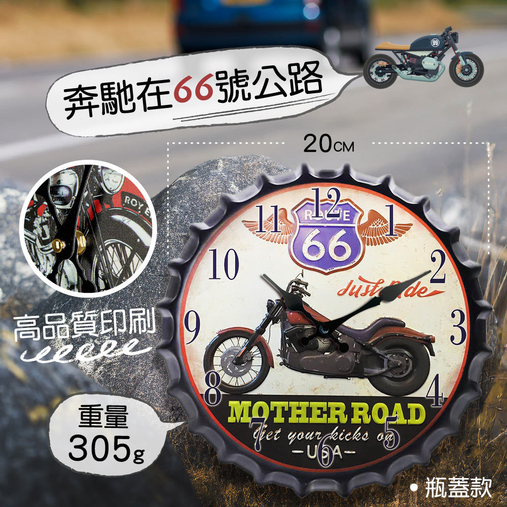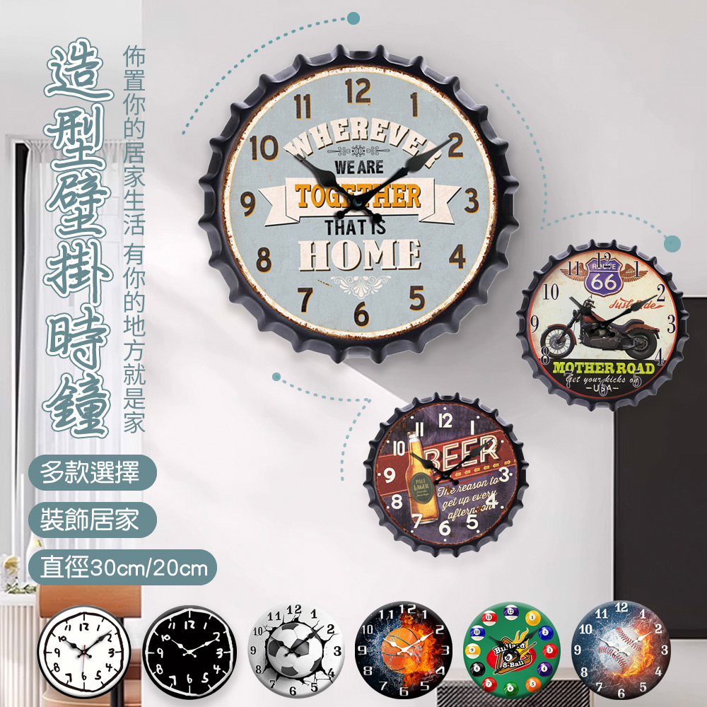 🕒 造型壁掛時鐘 🎨讓生活增添一抹風格!我們精選多款特色造型壁掛時鐘,從復古瓶蓋、摩托車、撞球主題到簡約設計,總有一款適合你的品味!商品特色:✨ 靜音石英機芯,無滴答聲🎯 一般款-直徑30cm/瓶蓋造型款-直徑20cm💪 一般款-310g/瓶蓋造型款-305g💪 一般款-木質/瓶蓋造型款-鐵材質🔋 使用1顆3號電池,方便更換貼心設計:無滴答聲設計,讓你安心入睡不受擾清晰數字刻度,輕鬆辨識時間簡單壁掛設計,輕鬆安裝不費力多款造型任選,打造專屬居家風格多款風格任選:🍺 復古瓶蓋造型:適合居酒屋、餐廳、酒吧氛圍🏍️ 奔馳66號公路:重機迷必備、工業風完美搭配🎱 來一場撞球吧:遊戲室、娛樂空間最佳選擇⚪ 黑與白的無限時空:現代風格、北歐簡約風完美呼應讓時鐘不只是計時工具,更是你家中獨特的裝飾品!快來為你的空間增添獨特品味吧! 🏠✨
