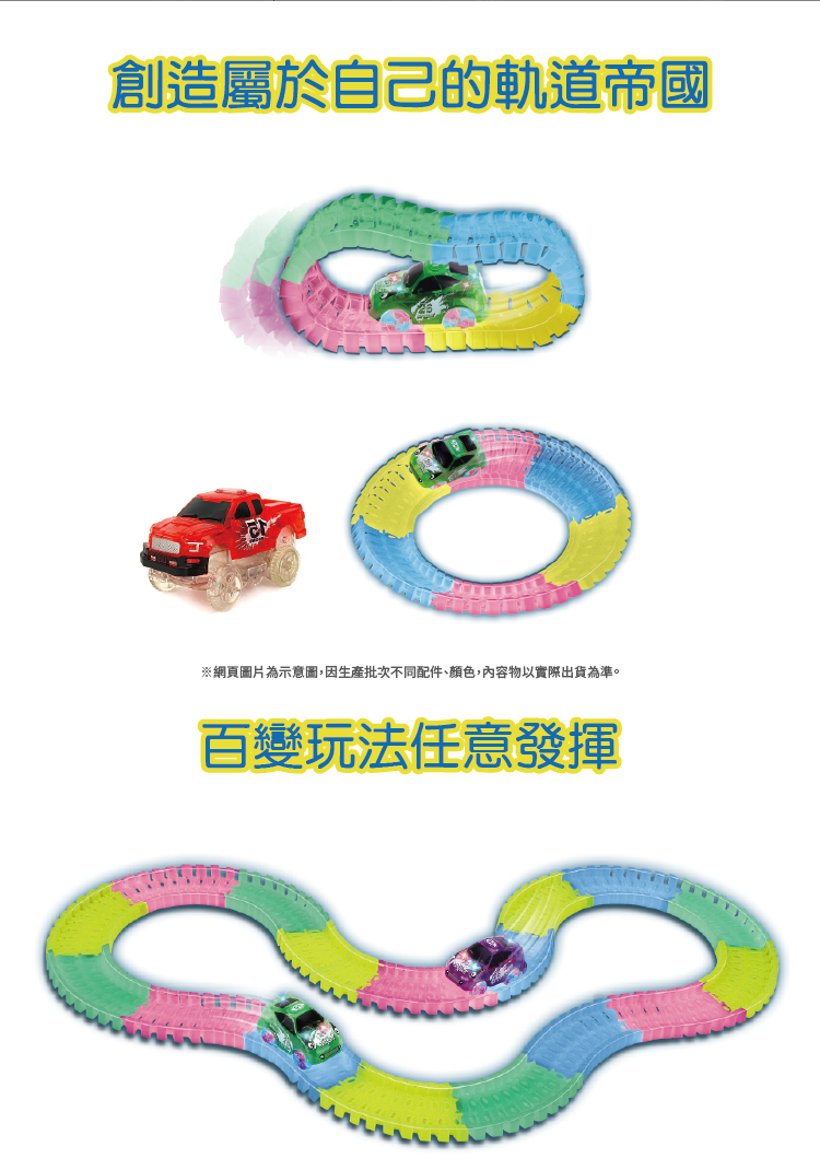 產品尺寸:車子x1台9.5x5x5.5cm 軌道+場景x165片2.5x7cm