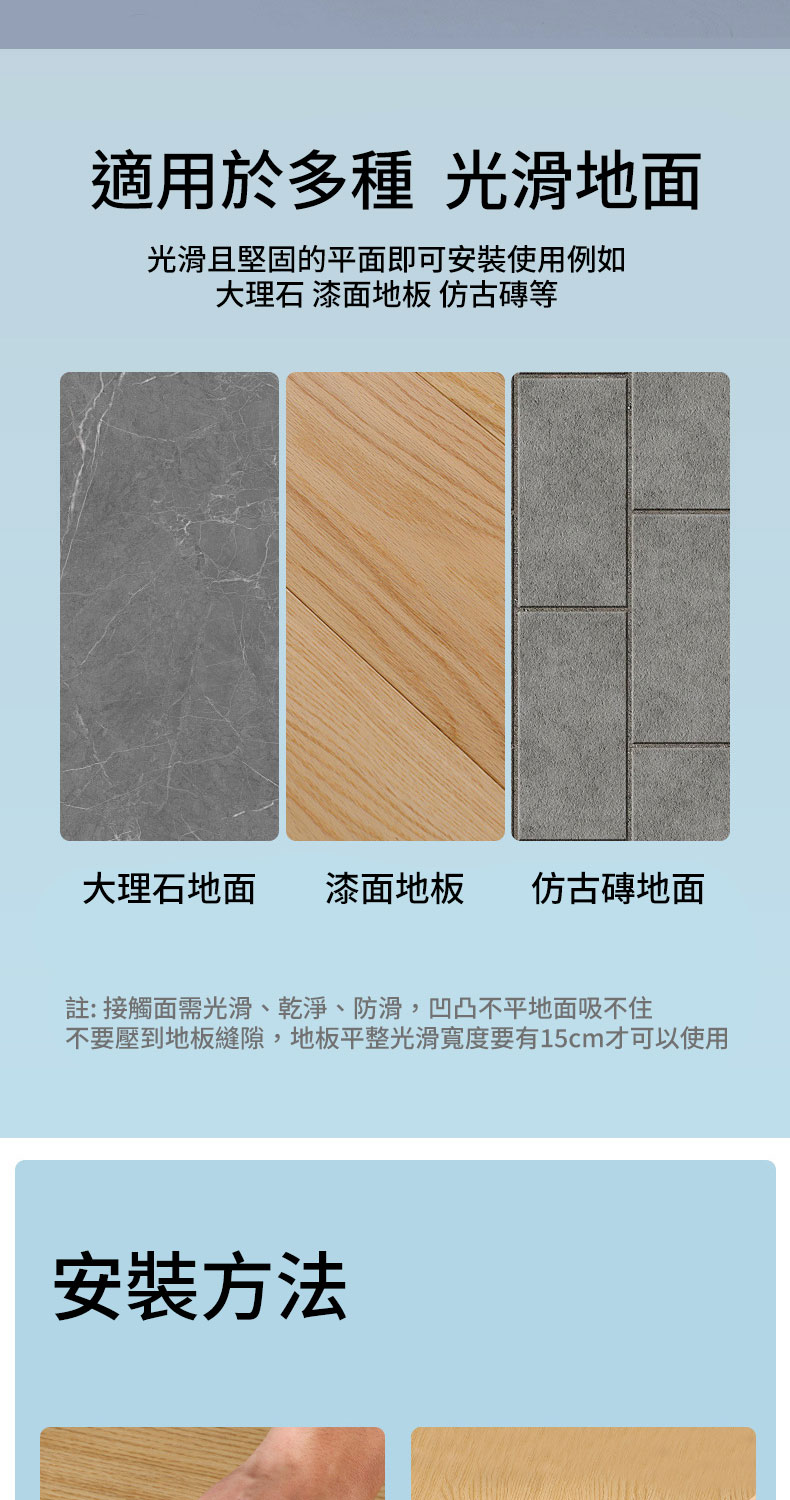 ⚠ 不適用:霧面、防滑、凹凸地板、拼接縫隙明顯處