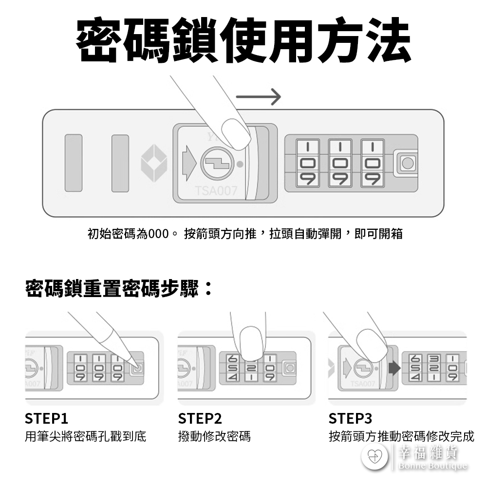 1、全PC材質,輕盈堅韌耐衝擊2、360度耐磨飛機輪,推拉省力又方便3、多段式鋁合金拉桿,可隨身高調整長度4、國際TSA海關鎖,快速通關安全又可靠