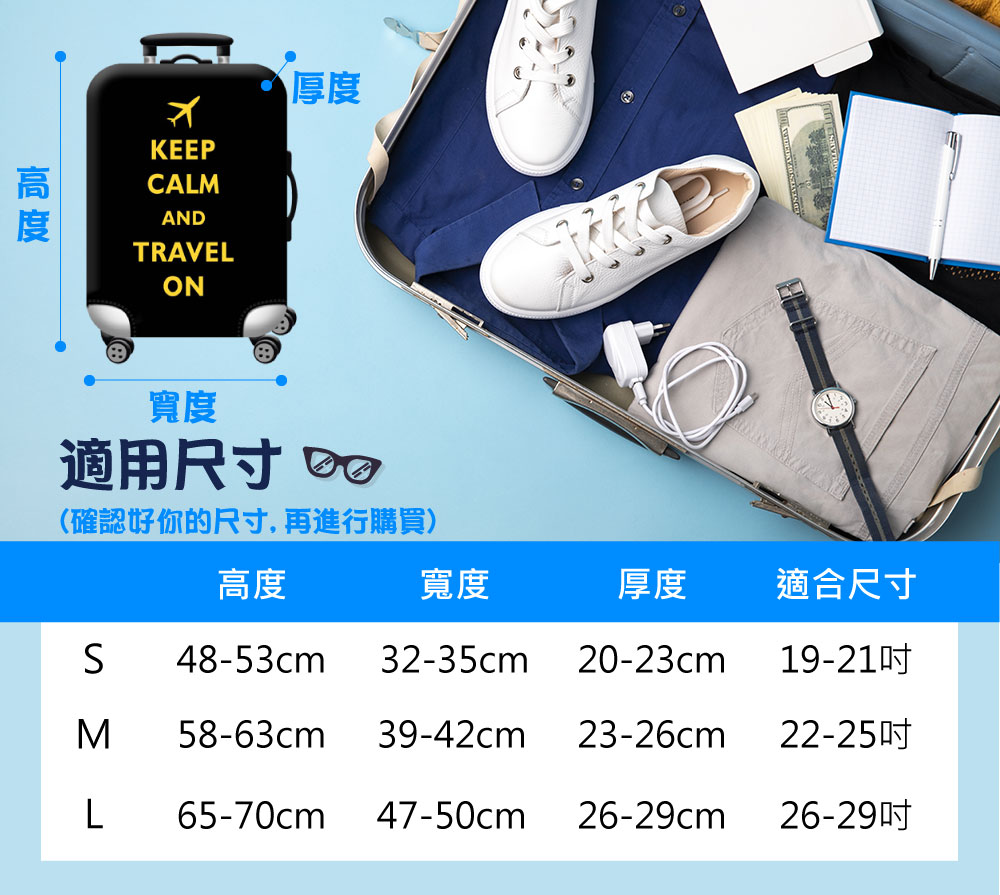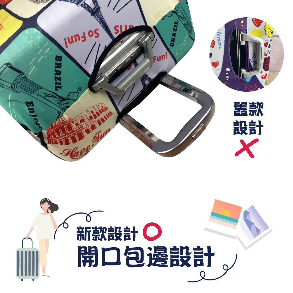 外出旅行擔心行李箱被亂丟刮傷??怕拿錯行李箱??加厚材質包邊車縫的保護套讓你使用更安心*緊密貼合彈性材質*印刷油墨精緻不掉色*多開口設計 方便好拿取*底部增加鬆緊帶牢固可靠尺寸:S-適用19-21吋行李箱 M-適用22-25吋行李箱 L-適用26-29吋行李箱