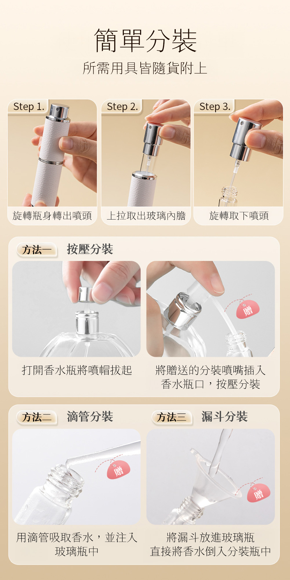 再使用附贈的 🎁 【按壓分裝頭】、【滴管】或【漏斗】 三種分裝配件