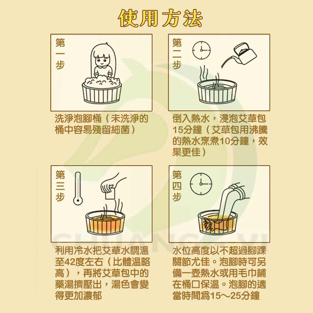 1. 將艾草包放入熱水中,再用毛巾擦拭身體、手腳、臉部即可