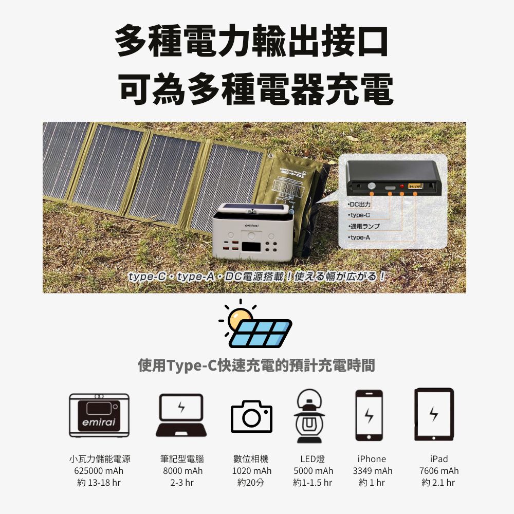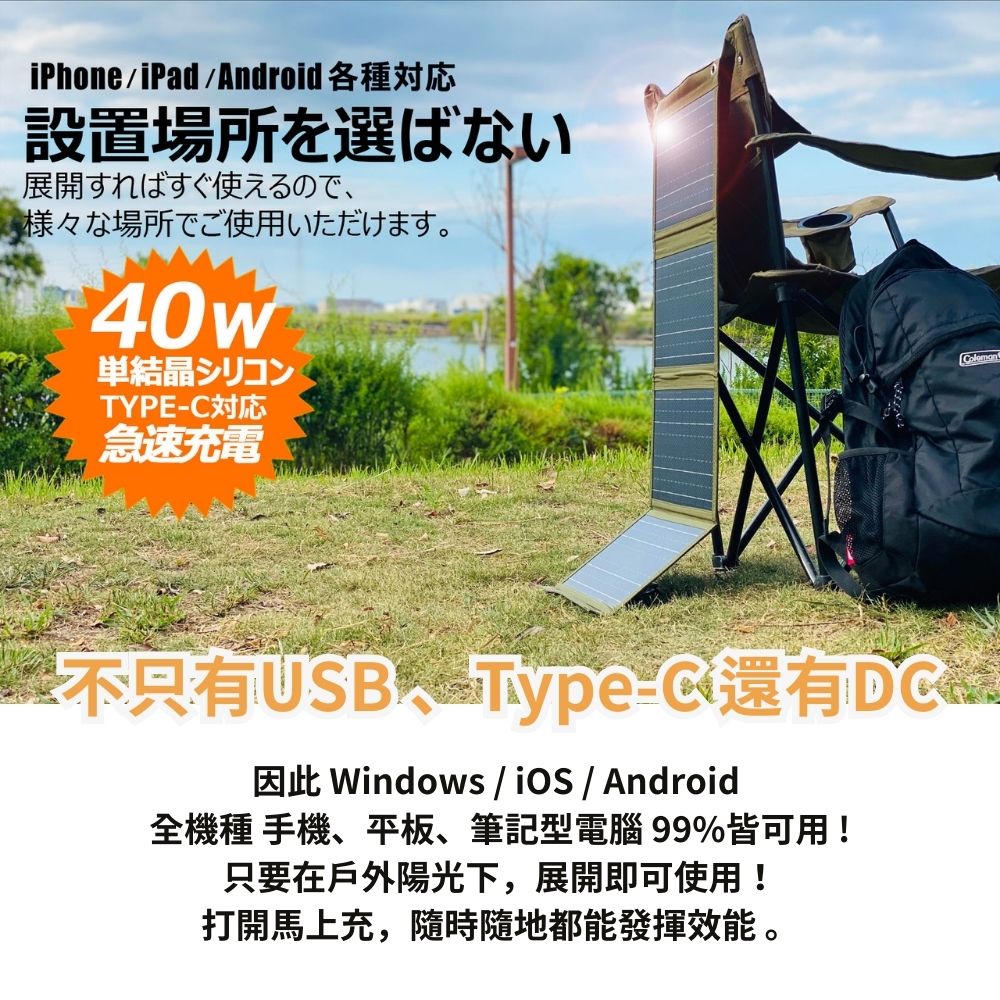 🌞有陽光,就能充電-輕巧折疊,僅iPad大小,方便攜帶與收納。🌞USB+Type-C+DC三種輸出可充手機、行動電源、小型USB 裝置、筆電。🌞附4個登山扣環-可掛在帳篷、背包、陽台,邊走邊充沒問題。🌞防塵防潑水設計(IPX5)-USB輸出藏在拉練收納袋,線材也能收納防護。