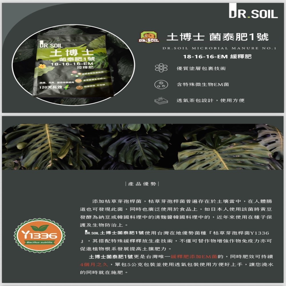 4.每顆控釋粒內皆包覆EM菌(估草桿菌)Y1336,施用後可幫助溶解介質中被固定且植物無法吸收之磷肥,幫助植物吸收肥份。