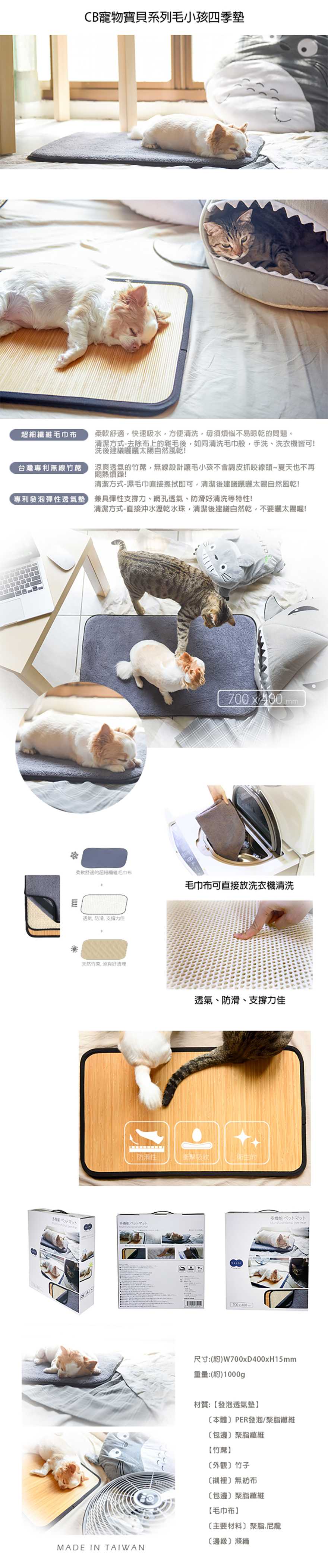 材質:[發泡透氣墊]本體-PER發泡、聚酯纖維/包邊-聚酯纖維[竹蓆]外觀-竹子/襯裡-無紡布/包邊-聚酯纖維[毛巾布]主要材料-聚酯、尼龍/邊緣-滌綸尺寸:W700 x D400 x H15 mm重量:1000g產地:日本授權台灣製造
