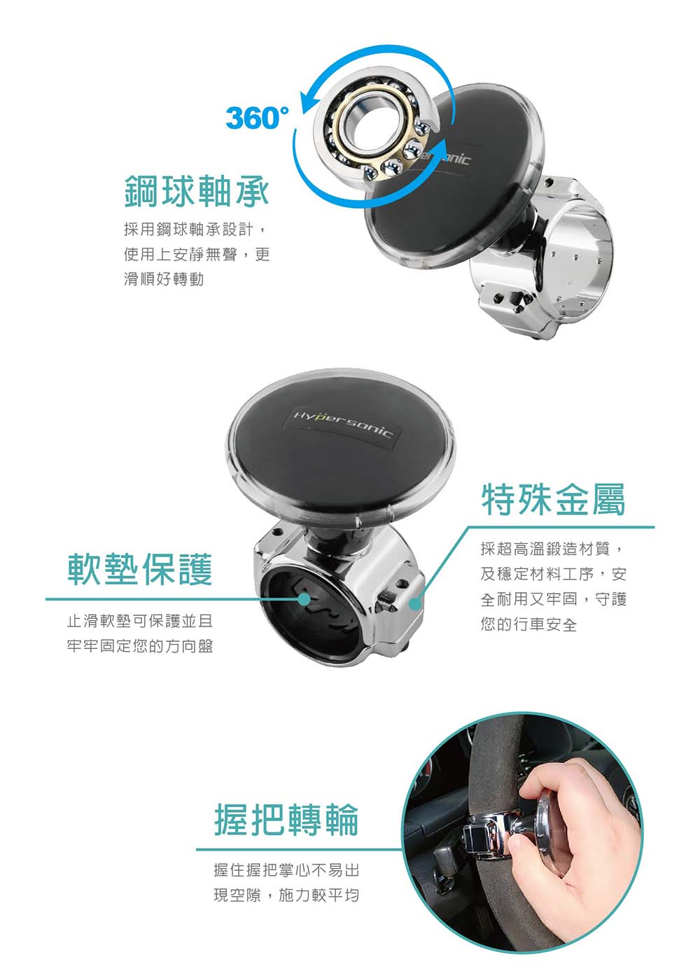 ‧ 品牌:Hypersonic‧ 品名:車用方向盤轉輪‧ 適用尺寸範圍:圓周約110~125mm(寬34mm 高36~42mm)‧ 材質:ABS‧ 顏色:黑色‧ 產地:台灣