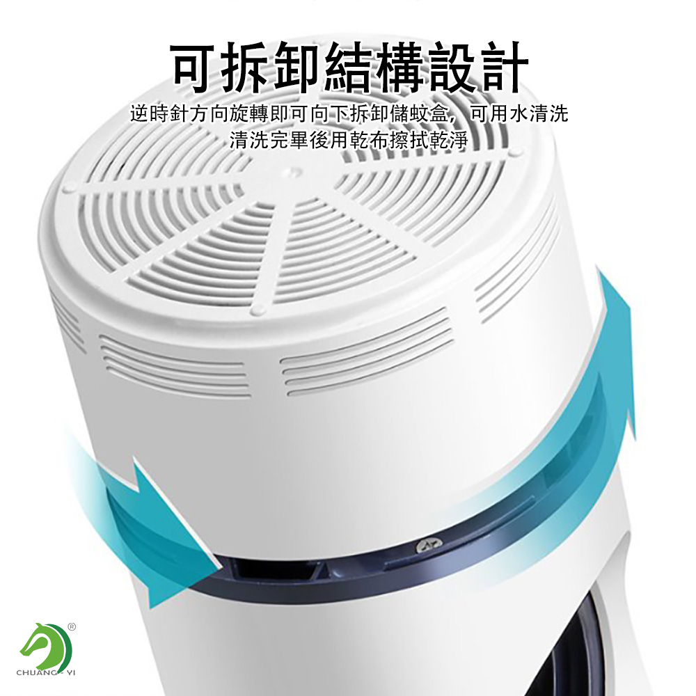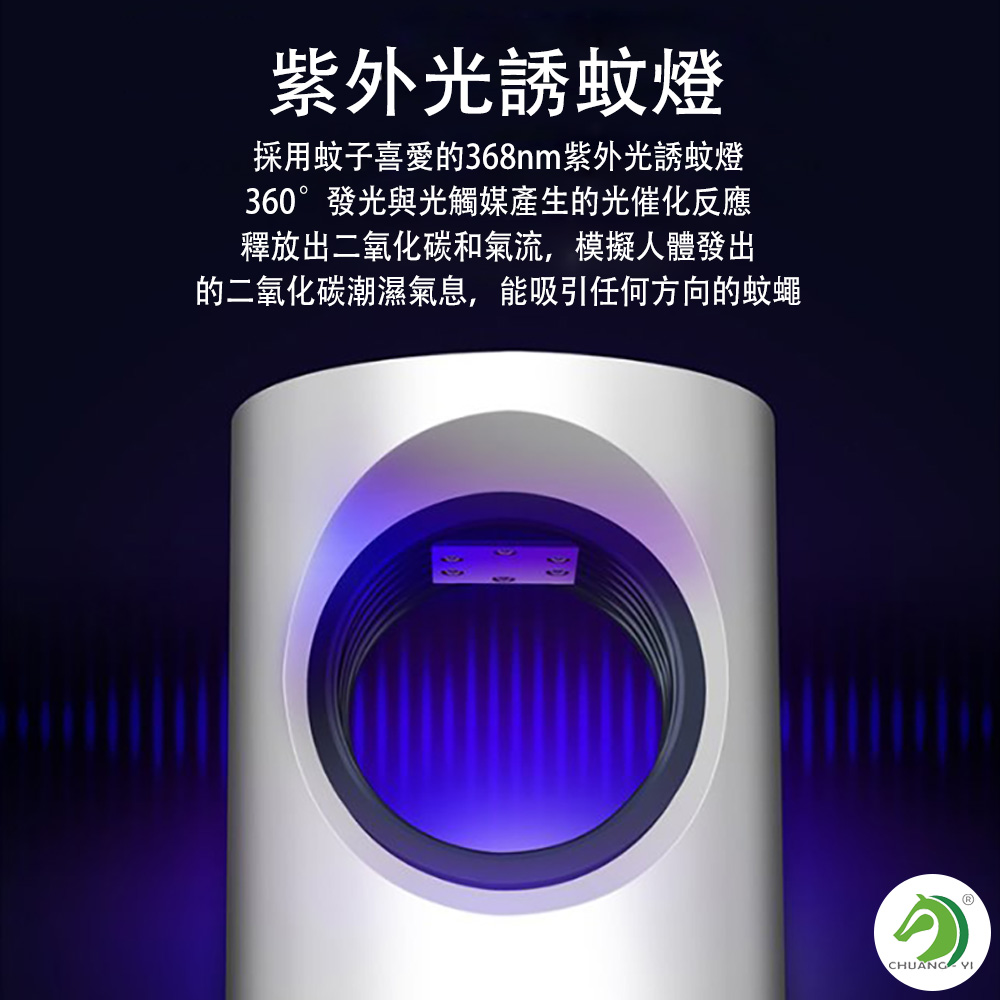 採用蚊子喜愛的368nm紫外光誘蚊燈 360°發光與光觸媒產生的光催化反應 釋放出二氧化碳和氣流,
