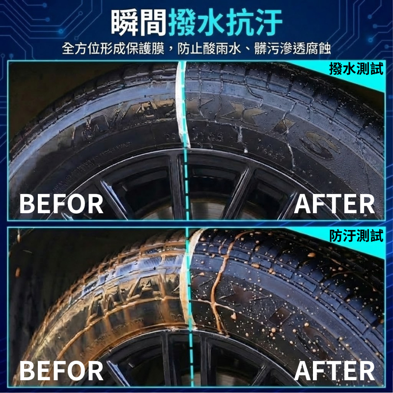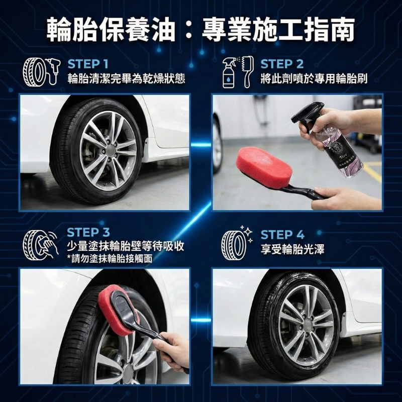 長效撥水保護膜:含有特殊矽氧烷成份,能在輪胎表面形成防水層,多次洗車或雨天行駛後仍保持黑亮如新。