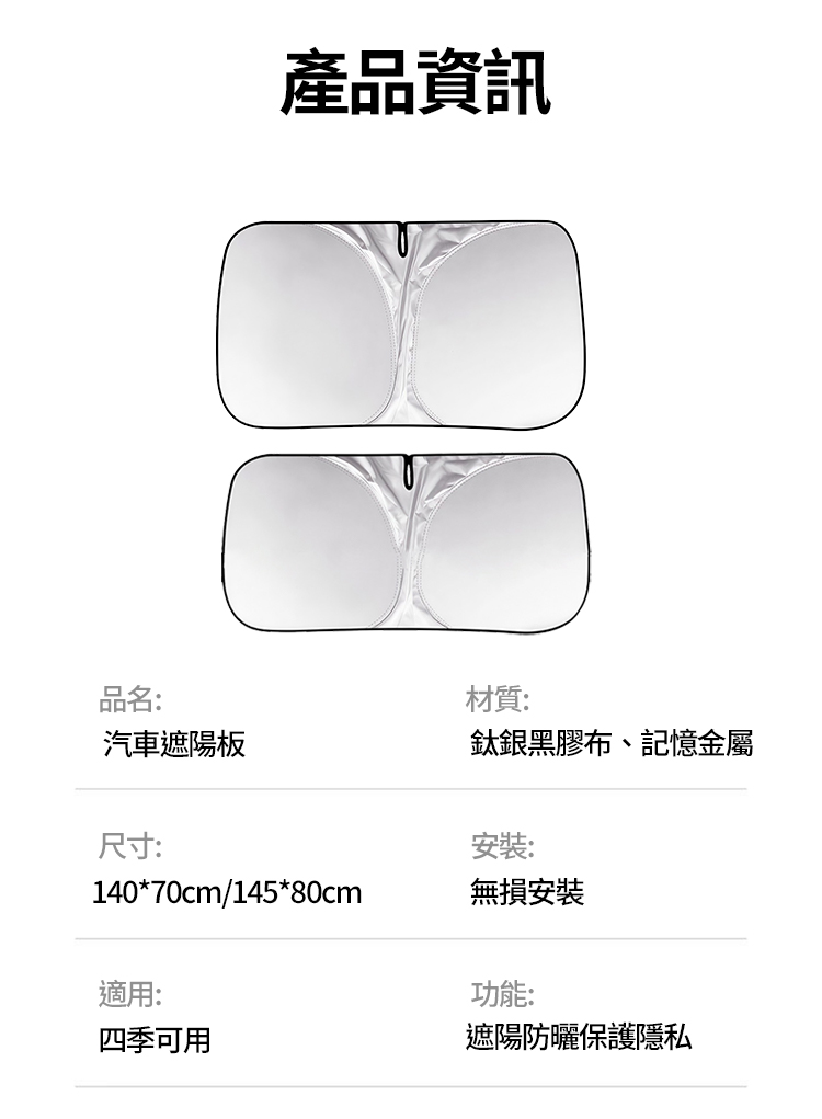 尺寸:145*80cm材質:鈦銀黑膠布、記憶金屬重量:165g材積:32*35.5*4cm