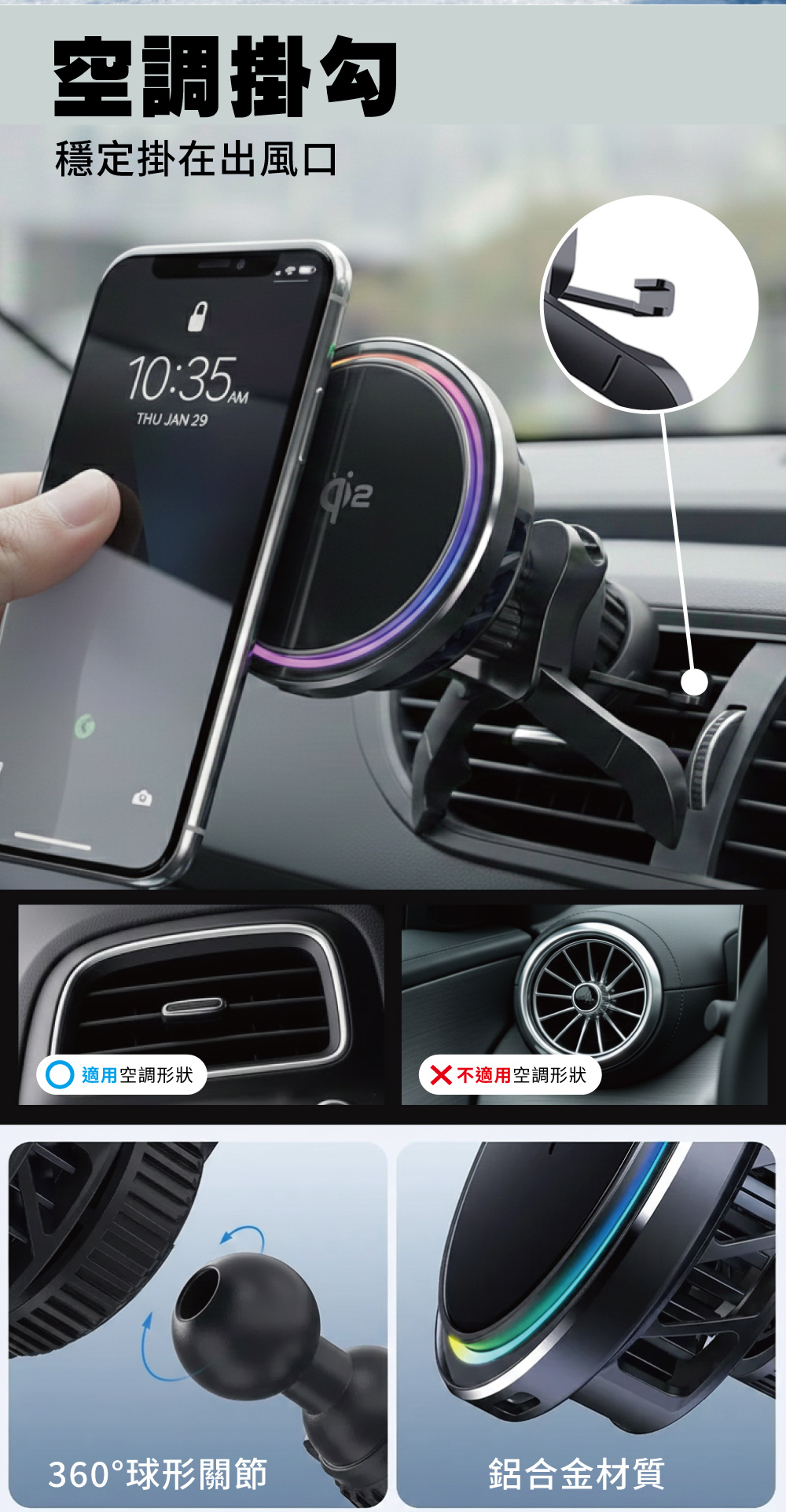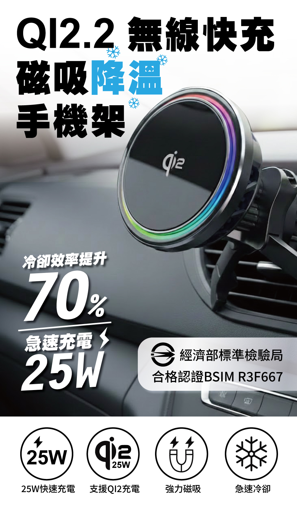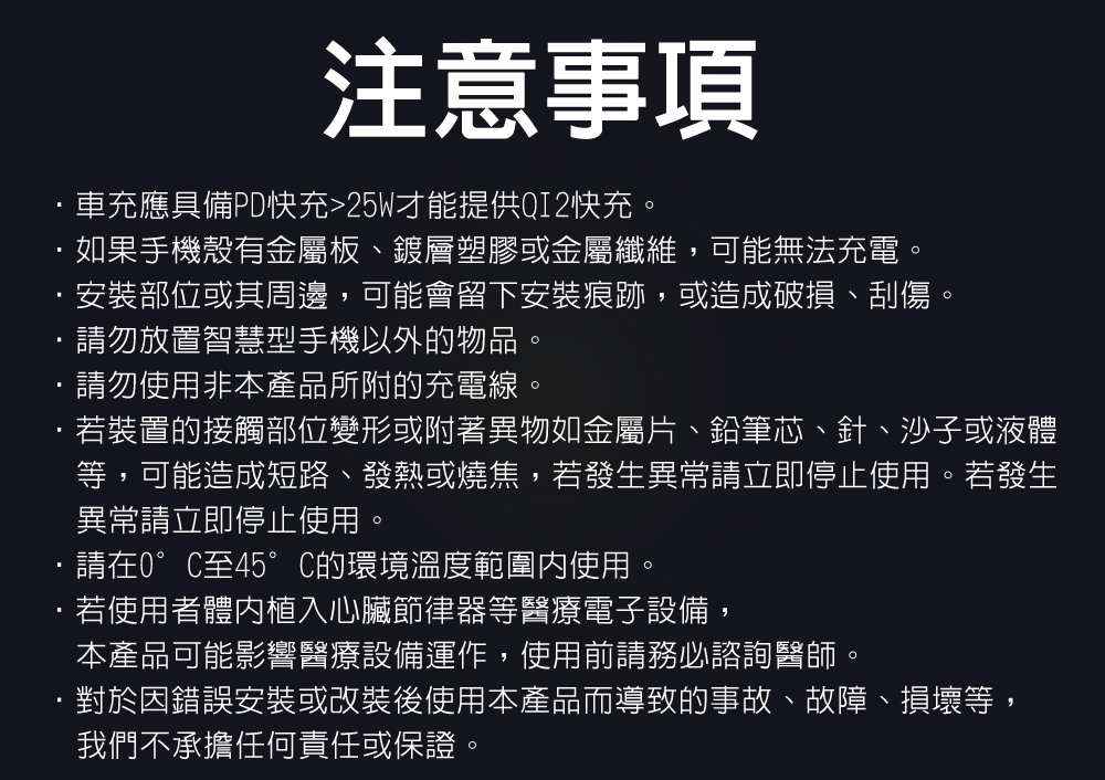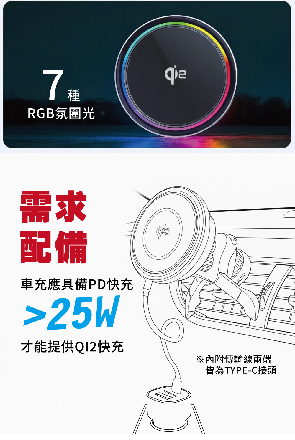 ・本產品不含 USB 電源供應器。需搭配 PD 25W 以上車充 才能啟用 Qi2 快充。