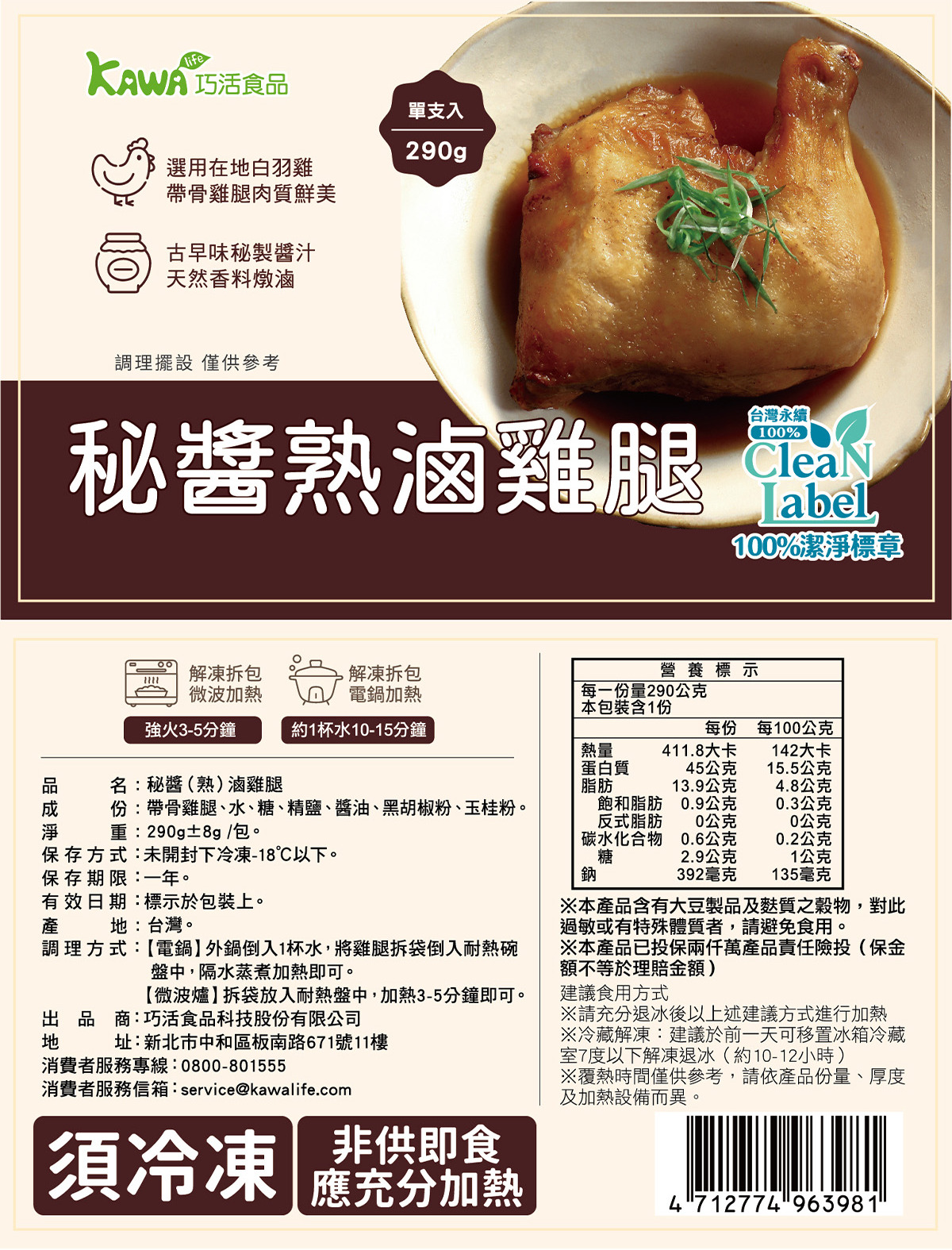 嚴選白羽雞整支帶骨雞腿製作,搭配醬油、糖、辛香料滷製!特選國產帶骨全雞腿,佐以醬油、糖、黑胡椒及玉桂粉天然香料滷燉,堅持傳統老味道。慢火精燉保留完整雞腿外皮,醬香滲透至內層,入口後骨香肉嫩且鹹度適中,舌尖瀰漫雞汁鮮香。富含雞凍膠質、清爽不油膩,簡單加熱即可享用,無論是佐餐或單吃,讓您大快朵頤享受無負擔好食。無添加味精、甜味劑及人工色素,純天然配方滷製,百分百安心食。