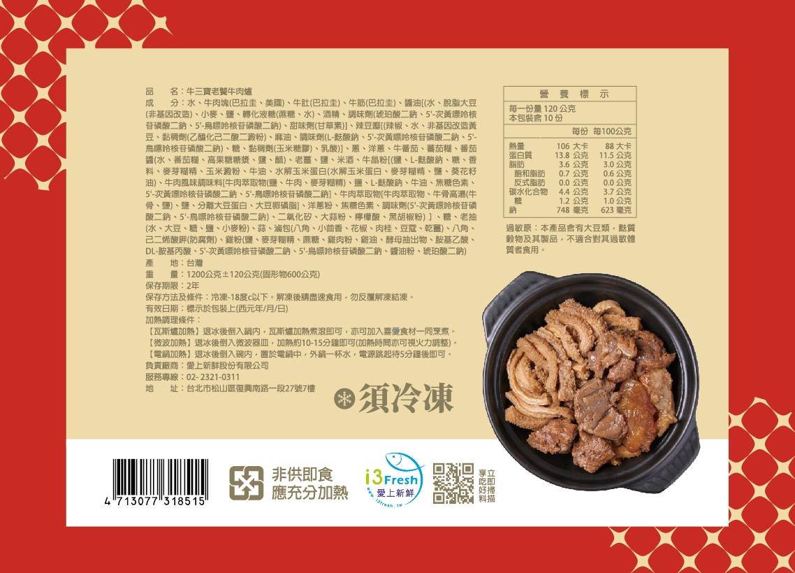 成分:水、牛肉塊(巴拉圭)、牛肚(巴拉圭)、牛筋(巴拉圭)、醬油[(水、脫脂大豆(非基因改造)、小麥、鹽、轉化液糖(蔗糖、水)、酒精、調味劑(琥珀酸二鈉、5'-次黃嘌呤核苷磷酸二鈉、5'-鳥嘌呤核苷磷酸二鈉)、甜味劑(甘草素)]、辣豆瓣[(辣椒、水、非基因改造黃豆、黏稠劑(乙醯化己二酸二澱粉)、麻油、調味劑(L-麩酸鈉、5’-次黃嘌呤核苷磷酸二鈉、5’-鳥嘌呤核苷磷酸二鈉)、糖、黏稠劑(玉米糖膠)、乳酸)]、蔥、洋蔥、牛番茄、蕃茄糊、番茄醬(水、番茄糊、高果糖糖漿、鹽、醋)、老薑、鹽、米酒、牛晶粉[(鹽、L-麩酸鈉、糖、香料、麥芽糊精、玉米澱粉、牛油、水解玉米蛋白(水解玉米蛋白、麥芽糊精、鹽、葵花籽油)、牛肉風味調味料[牛肉萃取物(鹽、牛肉、麥芽糊精)、鹽、L-麩酸鈉、牛油、焦糖色素、5'-次黃嘌呤核苷磷酸二鈉、5'-鳥嘌呤核苷磷酸二鈉]、牛肉萃取物[牛肉萃取物、牛骨高湯(牛骨、鹽)、鹽、分離大豆蛋白、大豆卵磷脂]、洋蔥粉、焦糖色素、調味劑 (5’-次黃嘌呤核苷磷酸二鈉、5’-鳥嘌呤核苷磷酸二鈉)、二氧化矽、大蒜粉、檸檬酸、黑胡椒粉)]、糖、老抽(水、大豆、糖、鹽、小麥粉)、蒜、滷包(八角、小茴香、花椒、肉桂、豆蔻、乾薑)、八角、己二烯酸鉀(防腐劑)、雞粉(鹽、麥芽糊精、蔗糖、雞肉粉、雞油、酵母抽出物、胺基乙酸、DL-胺基丙酸、5' -次黃嘌呤核苷磷酸二鈉、5' -鳥嘌呤核苷磷酸二鈉、醬油粉、琥珀酸二鈉)