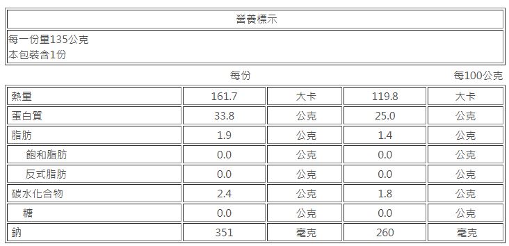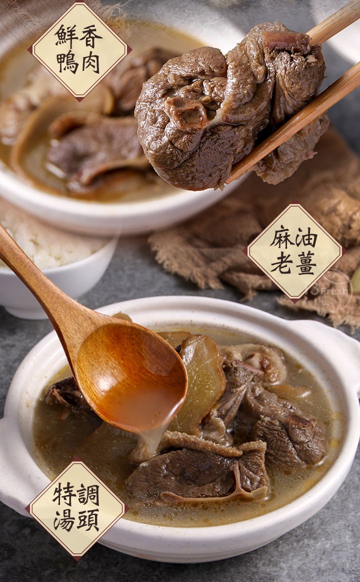 成分:高湯(水、豬骨(台灣)、雞骨、鴨骨)、鴨肉、米酒、薑、麻油、水、冰糖、鹽、胡椒粉、調味粉(L-麩酸鈉、胺基乙酸、DL-胺基丙酸、5'-次黃嘌呤核苷磷酸二鈉、5'-鳥嘌呤核苷磷酸二鈉、琥珀酸二鈉、麥芽糊精、豬肉抽出物、鹽、水解大豆蛋白、檸檬酸鈉、L-天門冬酸鈉、水解魚肉蛋白、洋蔥抽出物、氧化羥丙基澱粉、洋菇抽出物、中鏈三酸甘油酯、柴魚抽出物、二氧化矽、蒜抽出物、乳酸、維生素B1、香料、混合濃縮生育醇(抗氧化劑))、甘草粉。