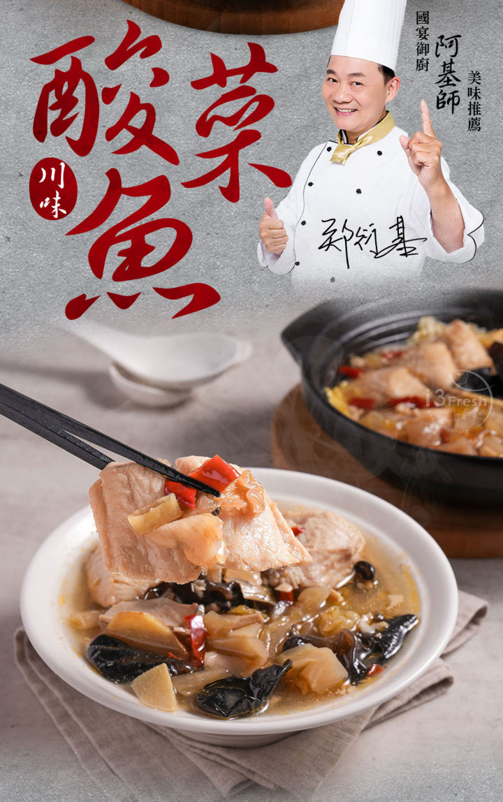 水、沙巴魚、酸菜(芥菜、鹽、水)、杏鮑菇、木耳、大豆沙拉油、白醋(水、米、釀造酢、果糖)、辣油(大豆油、辣椒粉、辣椒萃取物、辣椒紅色素)、蒜仁、薑、泡椒、花椒、朝天椒、鹽、二砂、大骨風味高湯粉【鹽、L-麩酸鈉、麥芽糊精、糖、玉米澱粉、香料、棕櫚油(棕櫚油、硬質棕櫚油)、酵母萃取物 (酵母萃取物、鹽)、豬肉粉 [豬肉(台灣)、鹽、多磷酸鈉、複合調味劑(乳糖、DL-胺基丙酸、調味劑( 5'-次黃嘌呤核苷磷酸二鈉、5'-鳥嘌呤核苷磷酸二鈉)、胺基乙酸、琥珀酸二鈉、檸檬酸鈉)、糖、維生素E (抗氧化劑)]、洋蔥粉、5'-次黃嘌呤核苷磷酸二鈉、5'-鳥嘌呤核苷磷酸二鈉、明膠、白胡椒】 過敏源:本產品含有魚類、大豆、麩質穀物和奶類製品之成分,不適合對其過敏體質者食用。