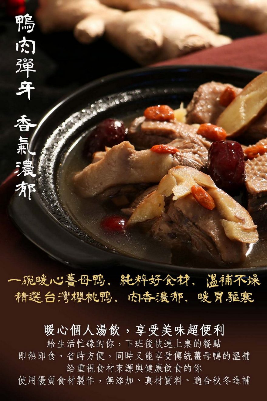 台灣櫻桃鴨 × 傳統薑母藥膳 × 無添加安心湯品「一碗暖心薑母鴨,純粹好食材,溫補不燥。」「精選台灣櫻桃鴨,肉香濃郁,暖胃驅寒」「無添加.最安心的家庭藥膳湯」「適合全家人的養生補氣首選」入秋必備,暖身首選每逢秋冬交替之際,湯品料理就是替身體打底的最佳補給!以天然食材熬製的薑母鴨腿湯,不僅溫潤脾胃,更能補足元氣。嚴選高端鴨肉代表—櫻桃鴨・相較於一般土番鴨肉質較柴,櫻桃鴨肉質緊實卻不失彈性,油脂分布均勻。・薄皮細緻、油脂適中,入口鮮香不膩。・常見於高級爐烤鴨料理,如今化身經典薑母鴨湯,更添層次,給注重養生、喜歡暖補、追求美味層次的饕客。滋補藥膳,香氣濃郁帶骨全鴨腿,搭配老薑、米酒、黑麻油,佐以枸杞、紅棗、當歸、川芎等中藥材,經高溫慢火熬煮,成就肉嫩湯鮮、香氣飽滿的暖心湯品。創意料理提案1. 原湯原食櫻桃鴨肉 肉質細緻、入口彈牙,鮮甜膠質在唇齒間縈繞;配上一碗香氣十足藥膳湯,溫潤暖胃,原汁原味最滿足。2.特色火鍋湯底將薑母鴨湯化身火鍋湯底,加入高麗菜、豆腐、洋蔥與喜愛的火鍋料,豐盛澎派,滿足全家人的圍爐時光。調理方式:「直火烹調」倒入鍋中,放置瓦斯爐以直火方式加熱至全滾。「蒸煮」倒入耐熱容器中,隔水加熱15-20分鐘至中心點熟透即可。「微波」倒入耐熱容器中,微波加熱15-20分鐘至中心點熟透即可。
