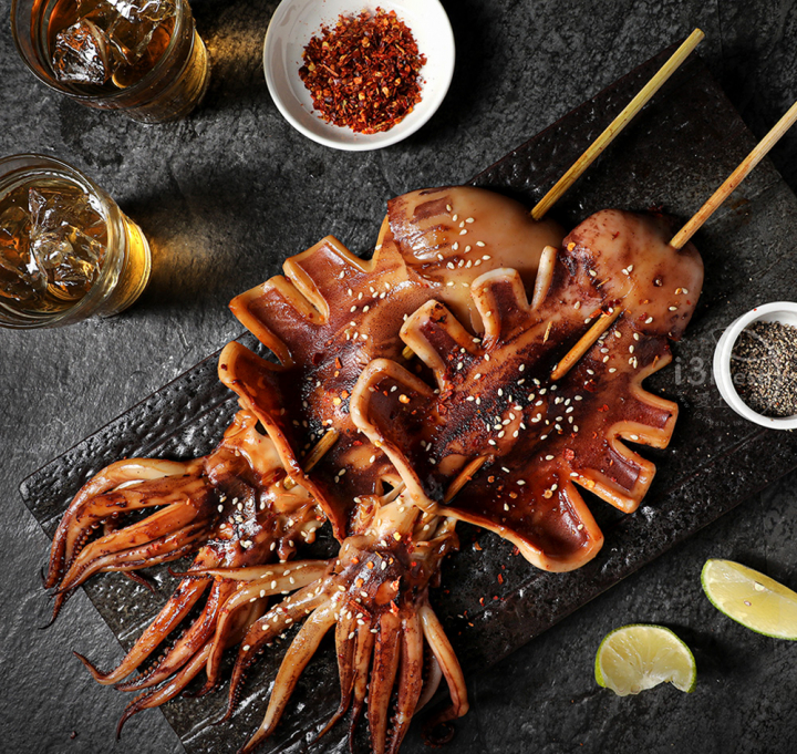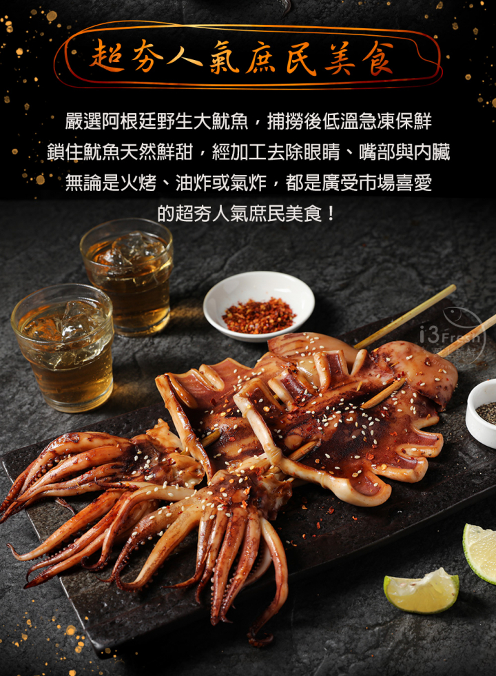 台灣遠洋漁船捕撈,優質的保鮮技術,讓魷魚吃起來鮮甜多汁,Q軟帶勁,以人工串籤,解凍後即可下鍋料理,搭配秘製烤肉醬、鹹香胡椒鹽或香辣粉,烤肉必備、下酒良伴,怎麼調味都好吃!